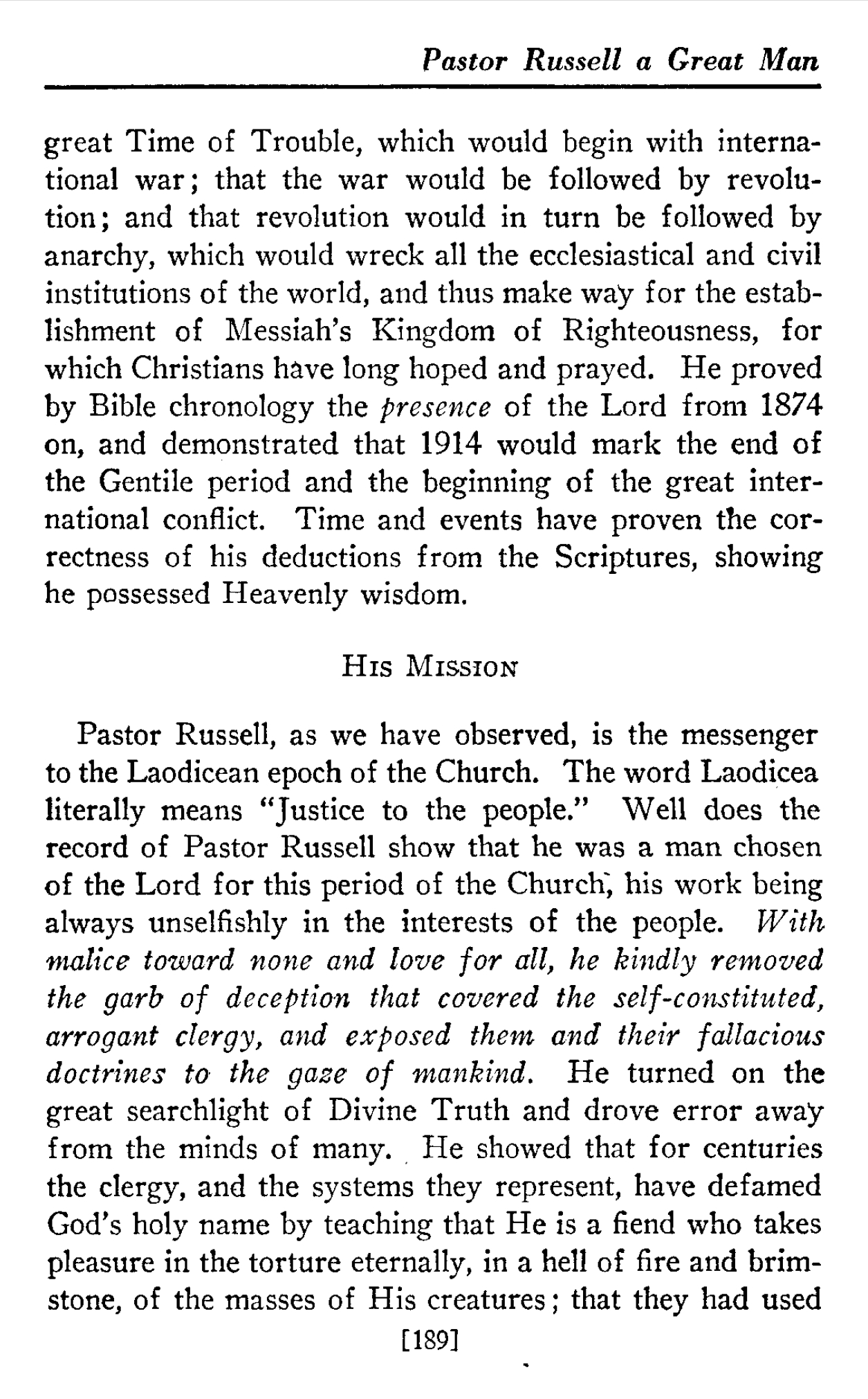 Pastor Russell, as we have observed, is the messenger to the Laodicean epoch of the Church. The word Laodicea literally means "Justice to the people." Well does the record of Pastor Russell show that he was a man chosen of the Lord for this period of the Church : his work being always unselfishly in the interests of the people. With malice toward none and love for all, he kindly removed the garb of deception that covered the self-constituted, arrogant clergy, and exposed them and their fallacious doctrines to the gaze of mankind. [...] It was the fight of this Laodicean Messenger in behalf of the people that enabled students of the Lord's Word to see that the Mystery of God is THE CHRIST, HEAD and Body; that The Messiah or Mystery class is developed during the Gospel Age; and that thereafter 1'Times of Refreshing shall come," when the great Restitution blessings for mankind will be put in operation. »