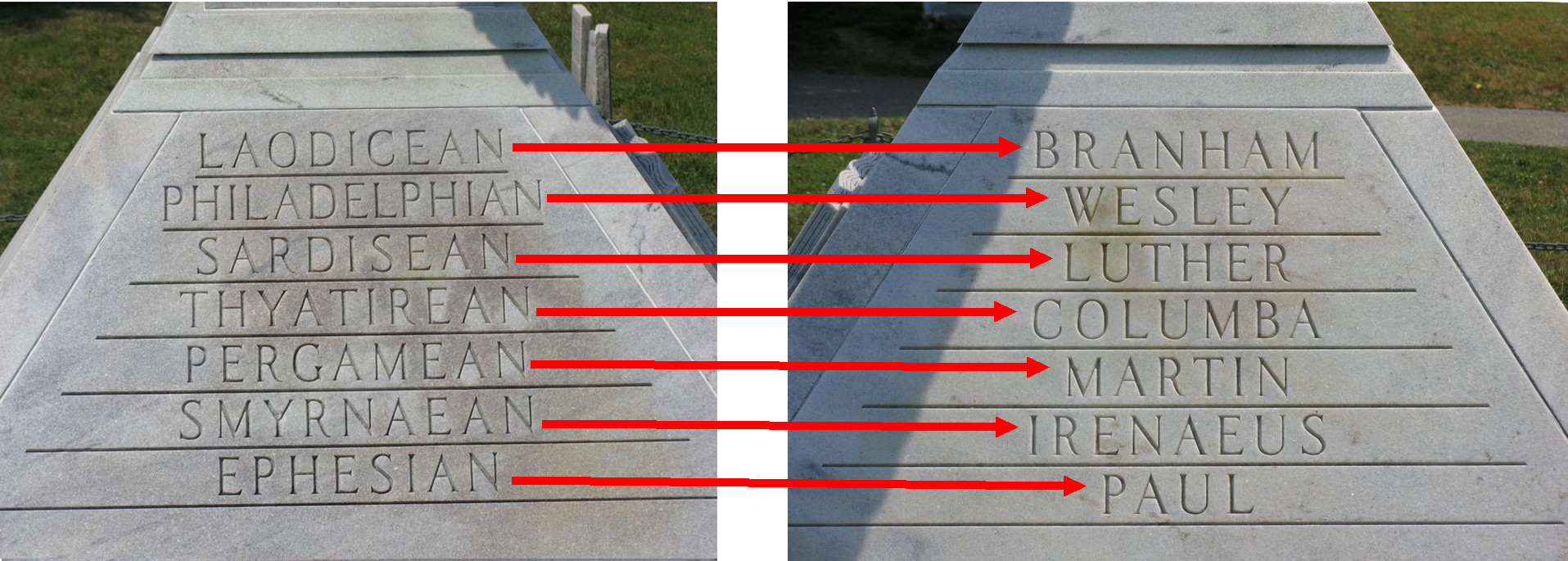 Selon Branham, les 7 églises d'Apocalypse (chapitre 2 et 3), correspondent à 7 âges de l'Eglise. Et chacun des 7 anges d'Apocalyse correspond à un leaders chrétien qui a eu le plus d'influence sur l'âge de l'Eglise en son temps. Voici la liste selon Branham , des 7 âges et des 7 anges qui leurs sont associés :
