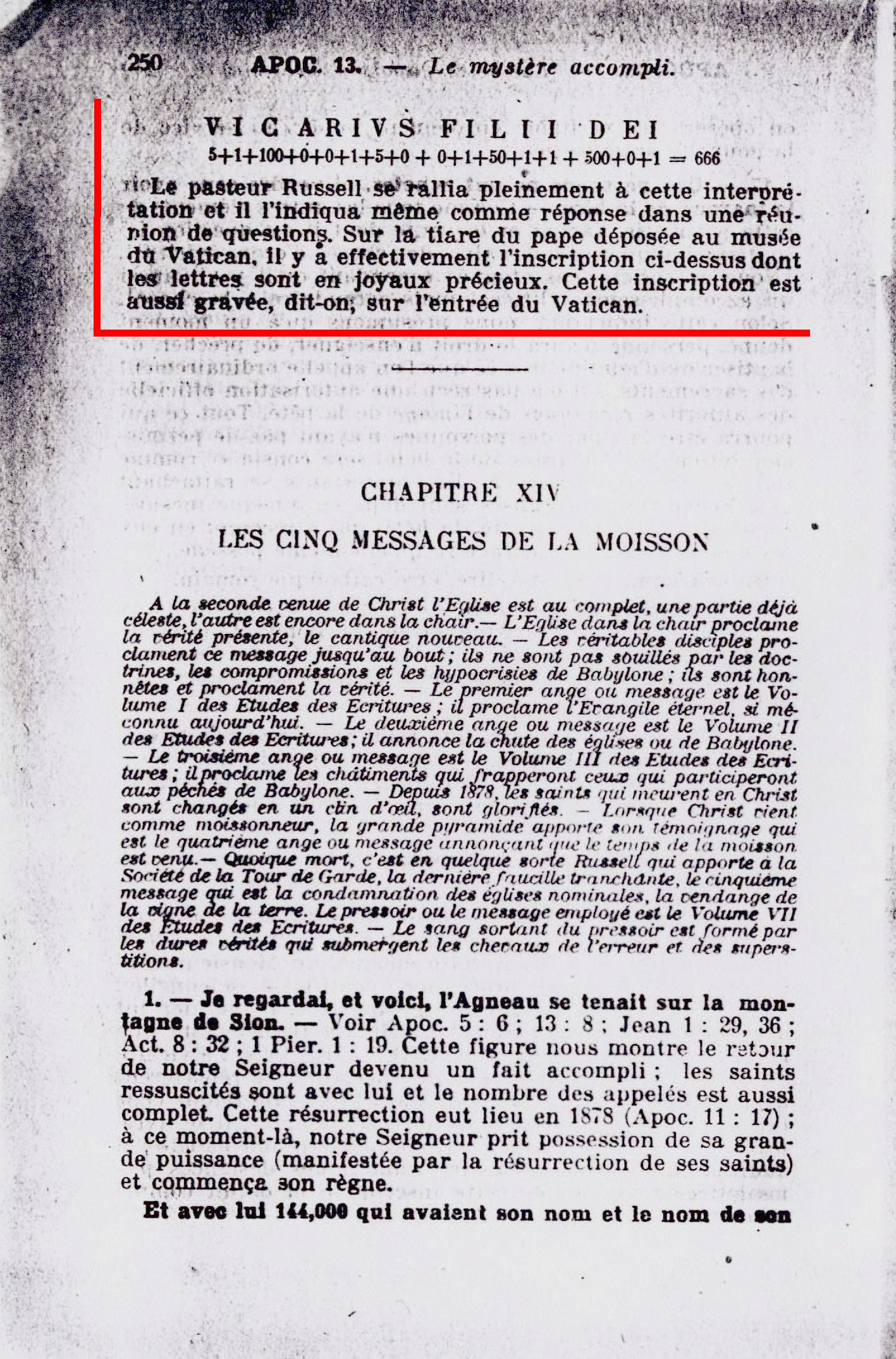 5+1+100+0+0+1+5+0+0+1+50+1+1+500+0+1=666 Le Pasteur Russell se rallia pleinement à cette interprétation et il l'indiqua même comme réponse dans une réunion de questions. Sur la tiare du pape déposée au musée du Vatican, il y a effectivement l'inscription ci-dessus dont les lettres sont en joyaux précieux. Cette inscription est aussi gravée, dit-on; sur l'entrée du Vatican. »