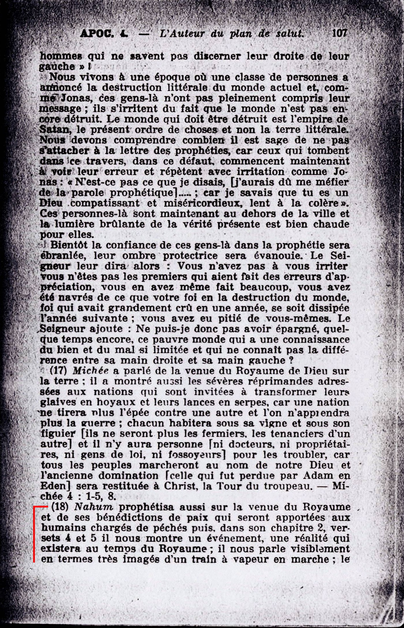 « ...Nahum prophétisa , ... dans son chapitre 2, versets 4 et 5 il nous montre un événement, une réalité qui existera au temps de Royaume; il parle visiblement en termes très imagés d'un train à vapeur en marche ; le terme hébreu qui a été traduit par char ou chariot, parfois même âr dromadaire (Es. 66:20), dépeint un véhicule de nature spéciale qui ne ressemble à aucun autre et qui paraît être une locomotive en mouvement pendant la nuit lorsque la lueur rouge des lanternes et du foyer vient projeter sa clarté empourprée sur les spectateurs qui regardent défiler le convoi; Nahum semble montrer en effet un train de nuit marchant à toute vapeur ; le chauffeur et le mécanicien sont fortement éclairés par l'aveuglante lumière du foyer grand ouvert lorsqu'il est alimenté. Les wagons puissamment illuminés donnent bien l'illusion de flambeaux marchant comme l'éclair dans la nuit. »