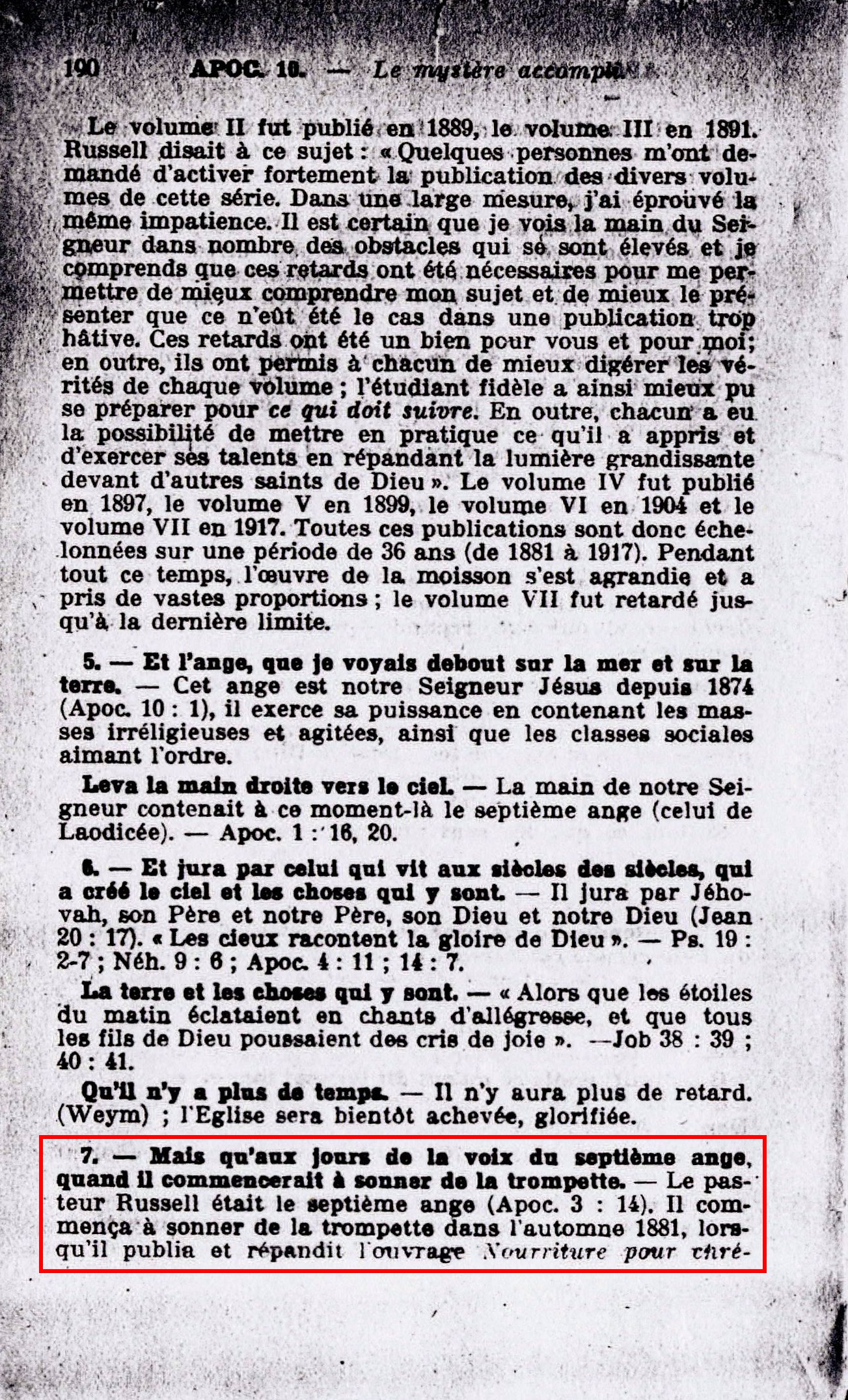 « Les sept tonnerres firent entendre leurs voix. - C'étaient les sept volumes des Etudes des Ecritures (Apoc. 8:5) qui étaient annoncés prophétiquement comme complément nécessaire pour exposer les plans de Dieu et dévoiler l'accomplissement de ce passage des Ecritures. »