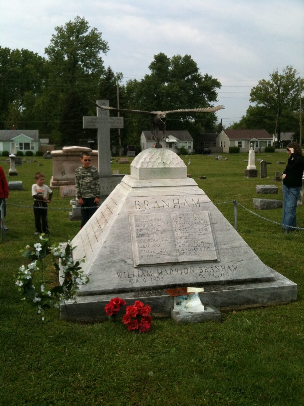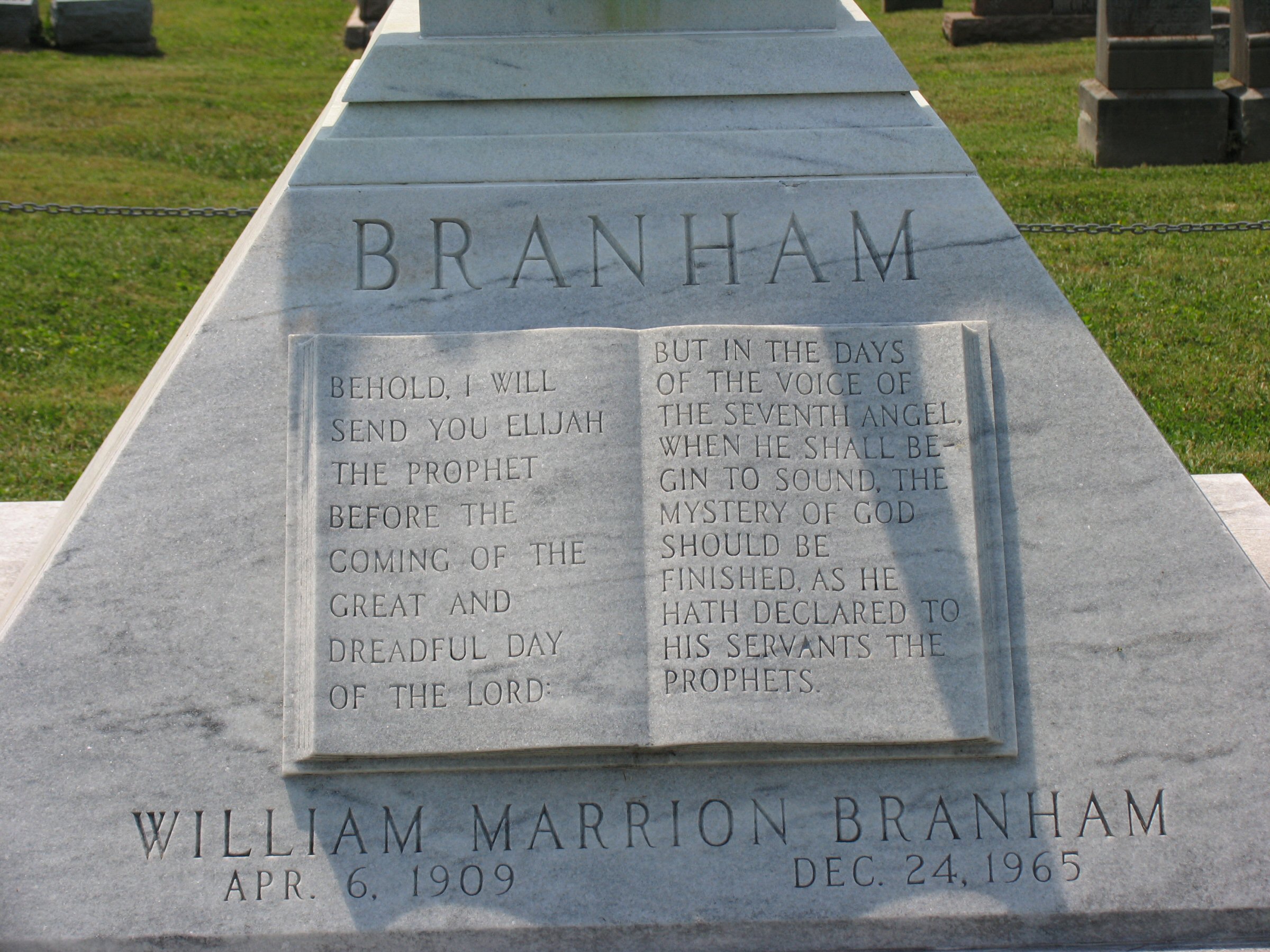 On peut voir au-dessus que Charles Taze Russell et William Branham ont eu droit tous deux, à une pyramide érigée à leur mort. Il ne vous échappera pas que les 2 pyramides comportent un livre gravé. On remarquera aussi que les deux pyramides ont une partie plus petite en haut. C'est la pyramide inachevée (symbole maçonnique).