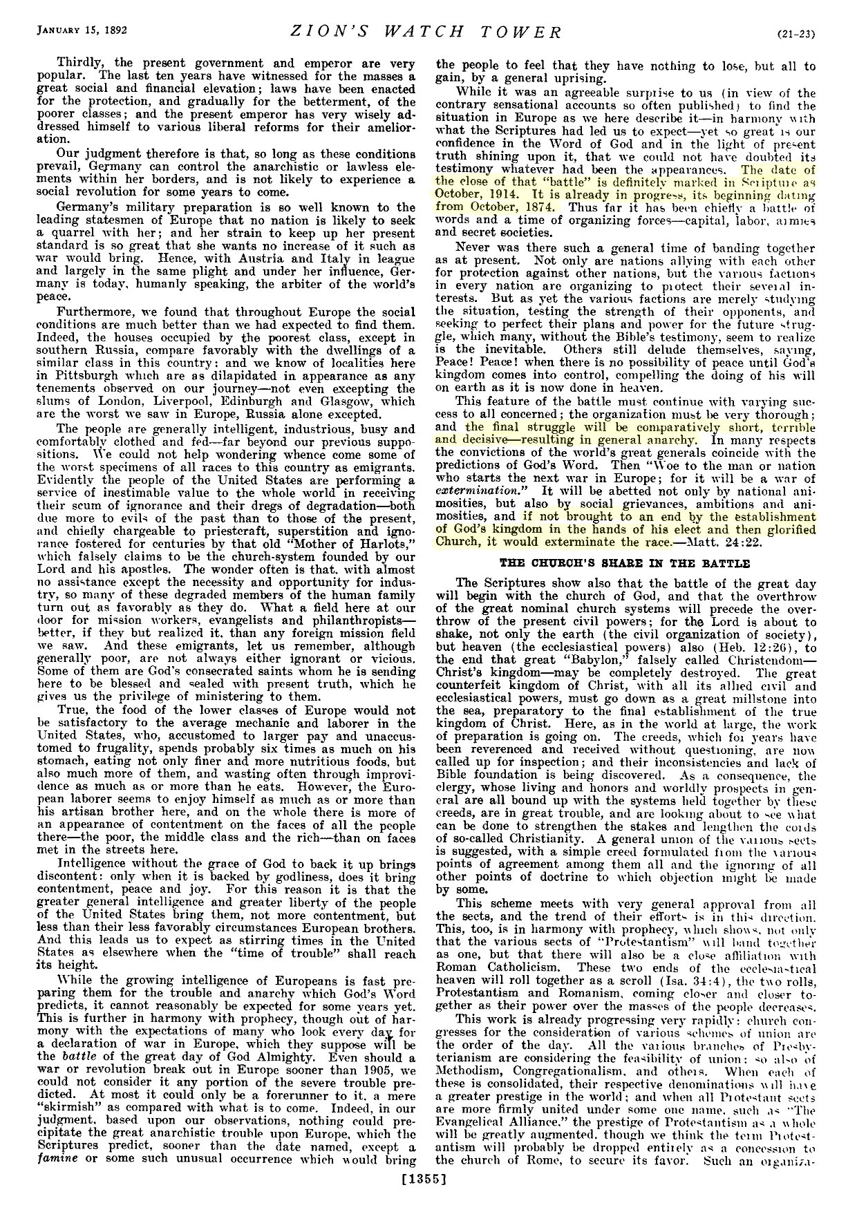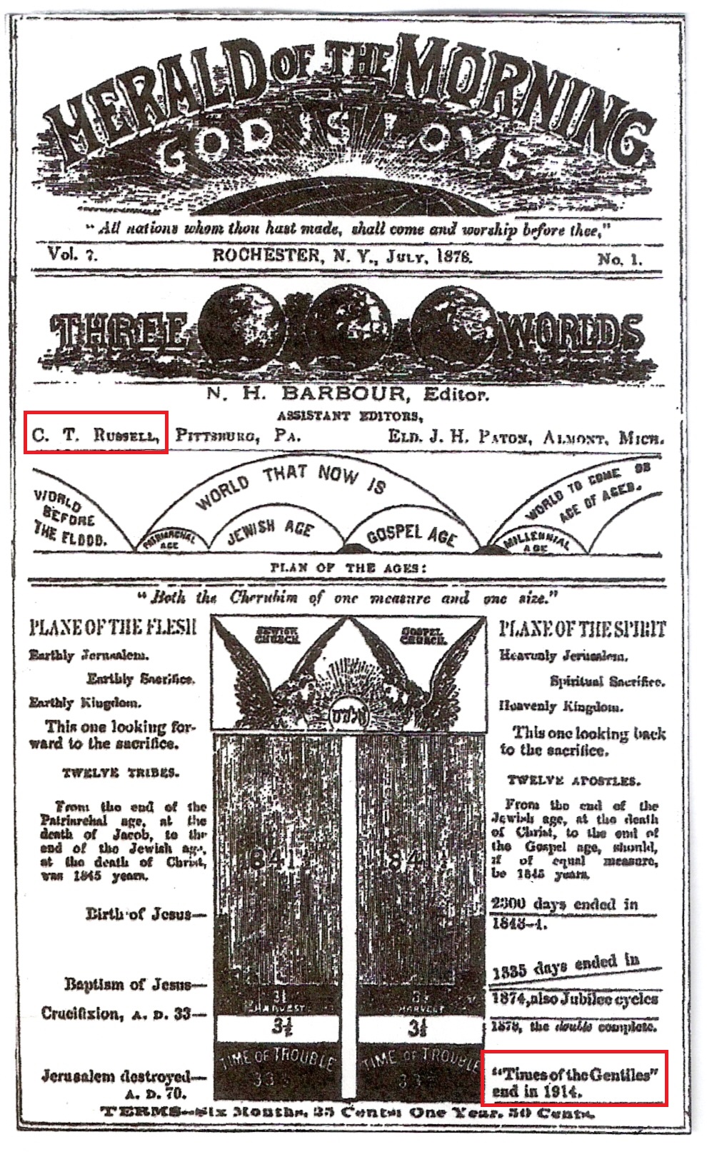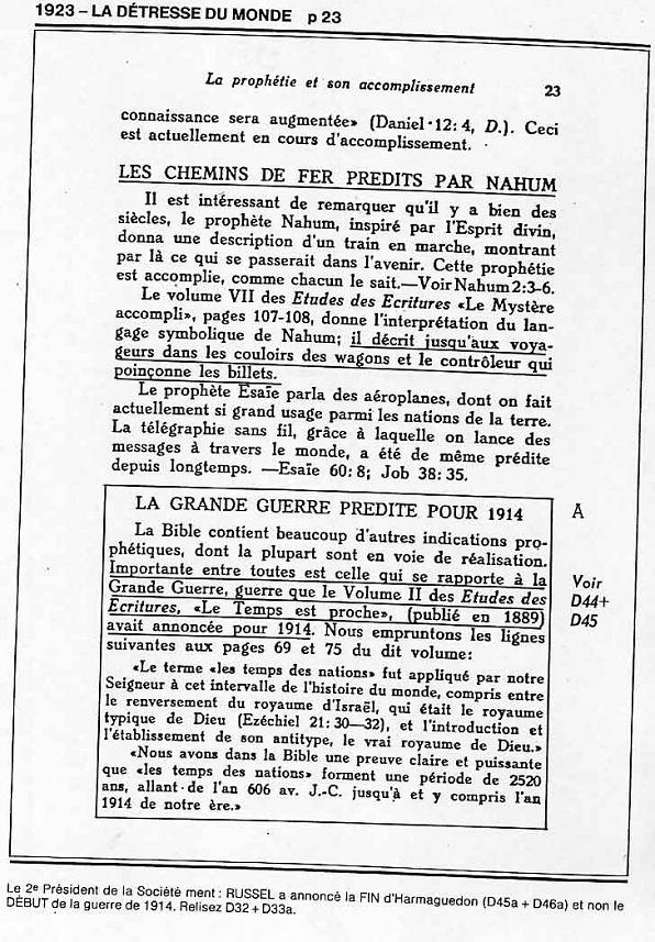 Russell fait plusieurs prophéties concernant 1914, Mais il n'y a aucune prédication de sa part au sujet du début d'une guerre mondiale cette année-là. Au contraire, Russell annonce la fin de la guerre par l'établissement complet du royaume de Dieu sur la terre. Il est bien clair que la SDTJ déforme délibérément les faits historiques à ses fins.