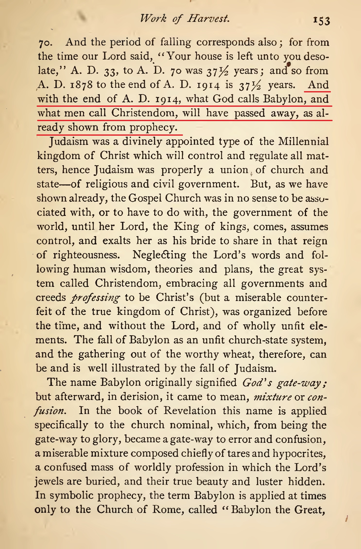 1914 est effectivement le fondement et le sommet de tous enseignements eschatologiques de Russell. Pendant quarante ans, il a prêché avec beaucoup de conviction et de zèle qu'en 1914 aurait lieu la fin du monde. Ce qu'il affirme à propos de 1914 et les autres dates ne sont pas des évantualités ou des probabilités mais des choses sûres et certaines. La chronologie que Russell présente n'est pas humaine mais divine. Voici ce qu'il dit à ce propos en 1894 :