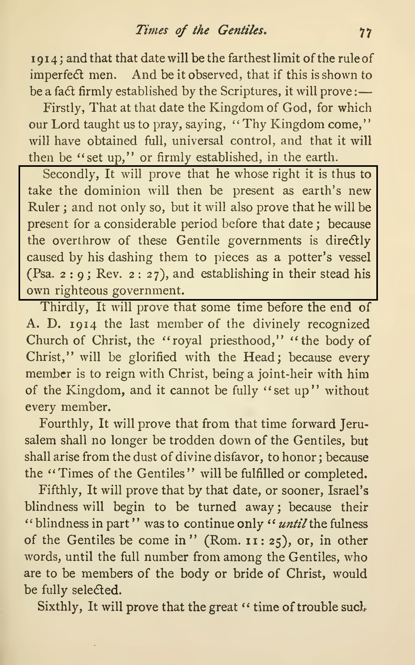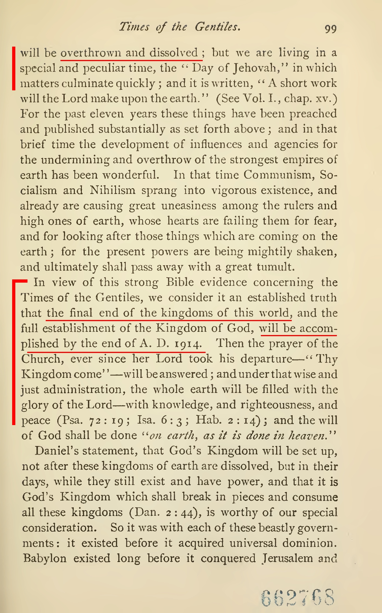 Notez bien que selon ces déclarations la fin des royaumes terrestres et l'établissement du royaume de Dieu sur la terre en 1914 ne sont pas partiels mais complets et définitives. À cette date-là, tous les gouvernements seront anéantis par le royaume de Dieu, et ainsi la volonté divine sera réalisée et appliquée sur toute la terre comme au ciel.