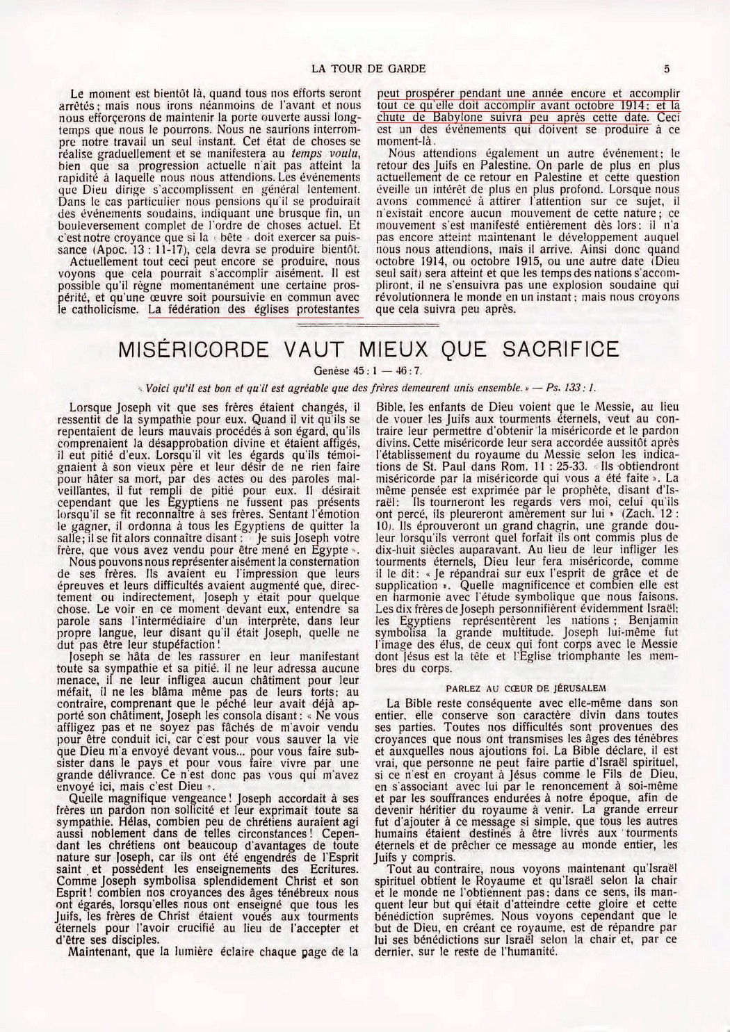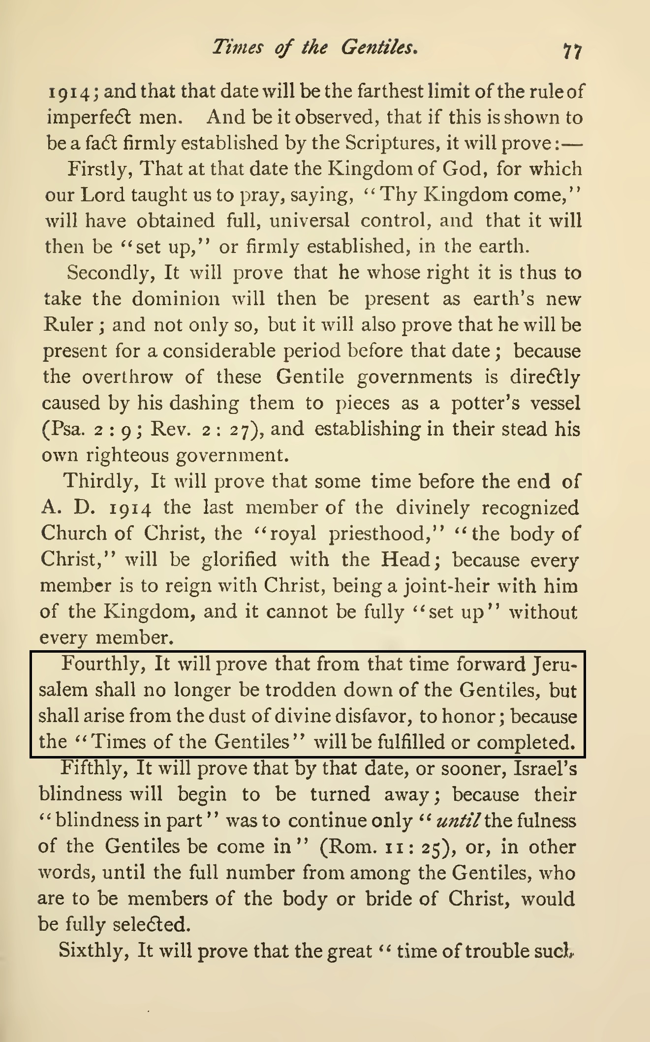 4) En 1914 Jérusalem sera rétablie complètement et elle ne sera plus foulée aux pieds par les non-Juifs :