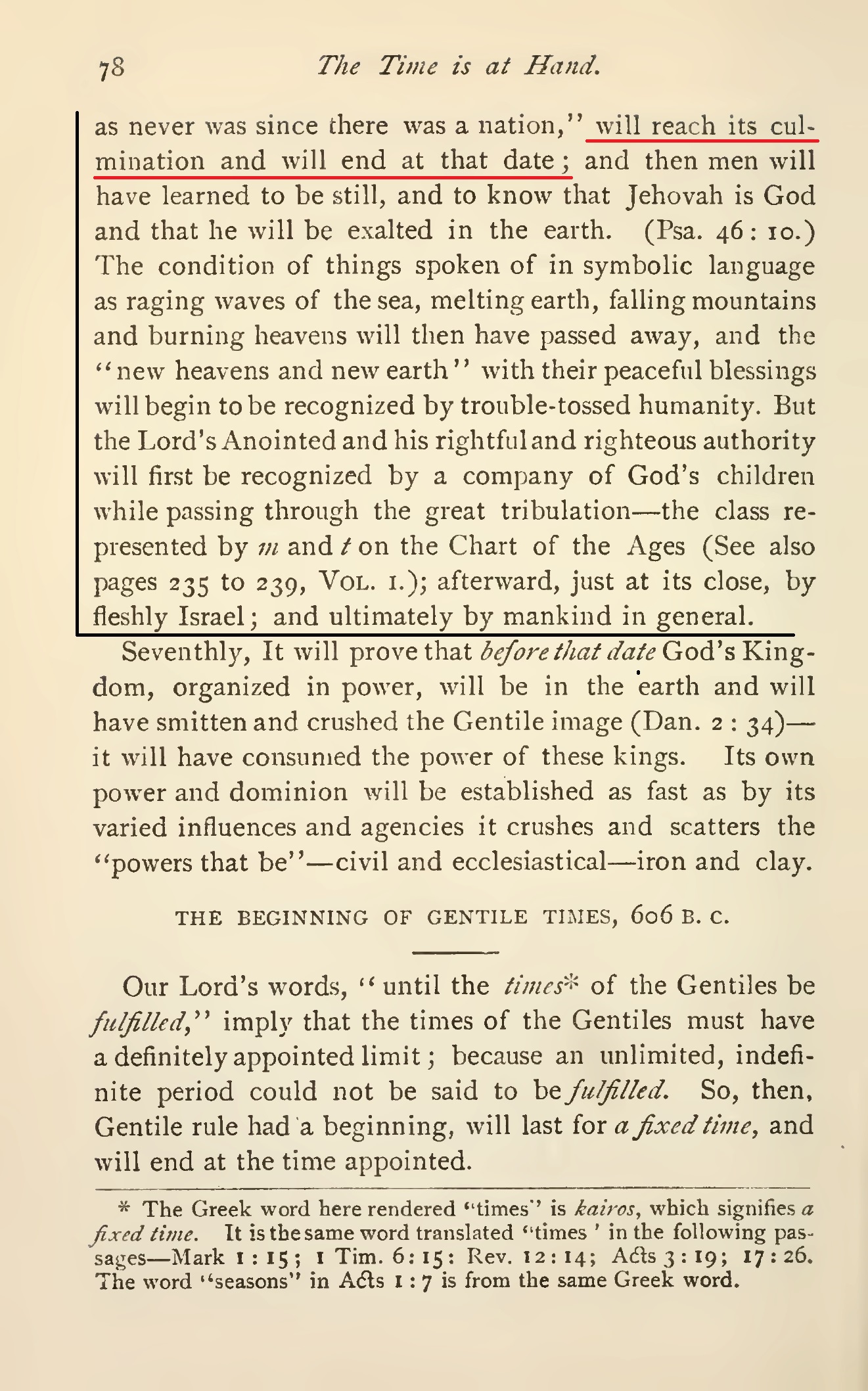 Ce temps est une période de " sept temps ", qui correspond prophétiquement à 2520 jours-années, qui ont commencé en 606 av. J.-C. et qui se terminent en 1914.