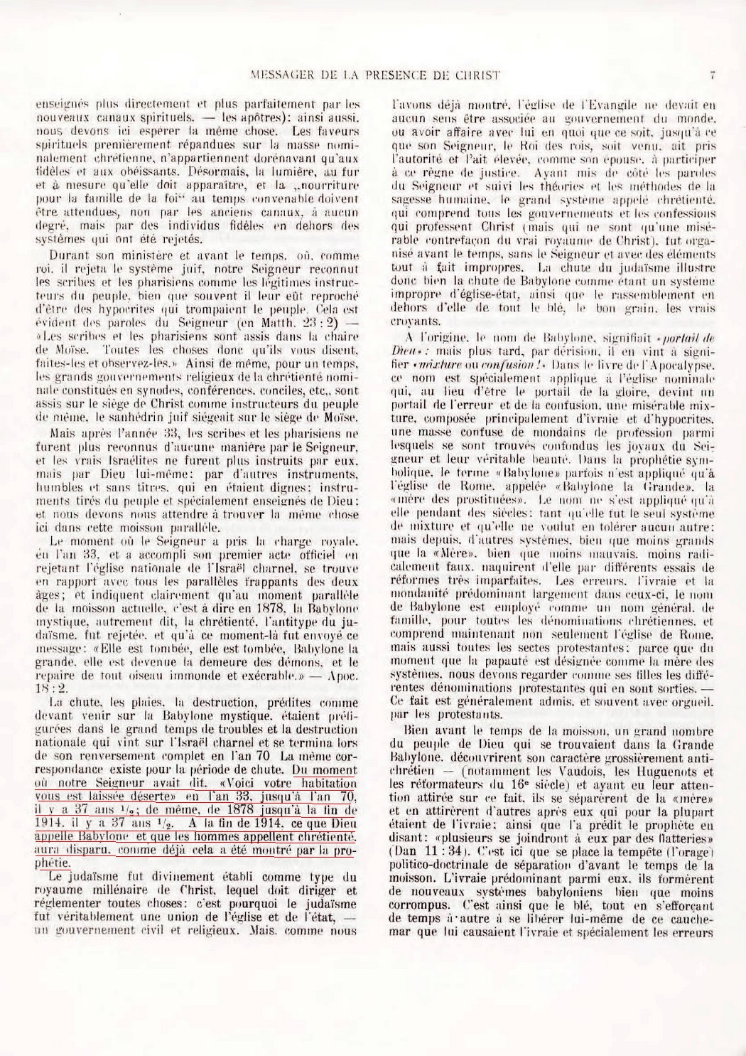 7) Le grand jour de Jéhovah ou Harmaguédon, qui a commencé en 1874 s'achèvera en 1914 :
