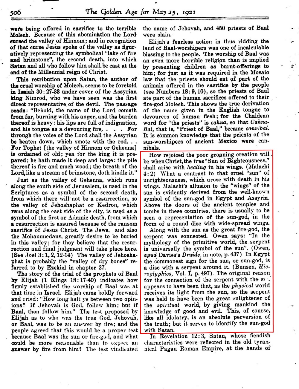 En 1921, le périodique The Golden Age a publié un article de Morton Edgar, auteur renommé en pyramidologie et en mythologie égyptienne (auteur qu’ils ont dénoncé plus tard à cause de son implication en pyramidologie). Dans cet article, il fait mention du disque solaire ailé et de ses significations païennes, religieuses et occultes. Il a écrit :
