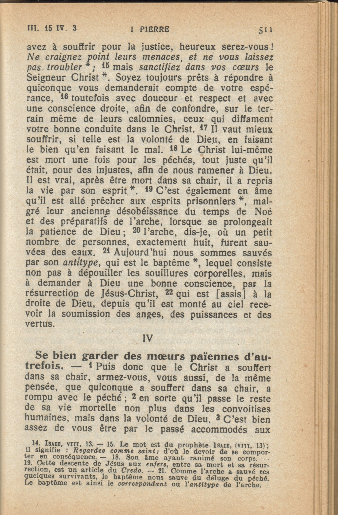 Tout comme la TMN, d’autres traductions soulignent également le parallèle entre 1 Pierre 3:14-15 et Ésaïe 8:12-13. Citons, par exemple, le Nouveau Testament (Annoté) par le T. R. Père Buzy (1949) :