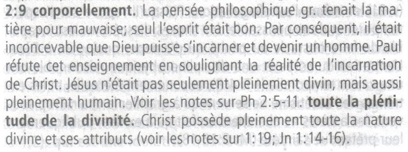 - Car en lui, habite corporellement toute la plénitude de la divinité. (Bible à la Colombe + #)