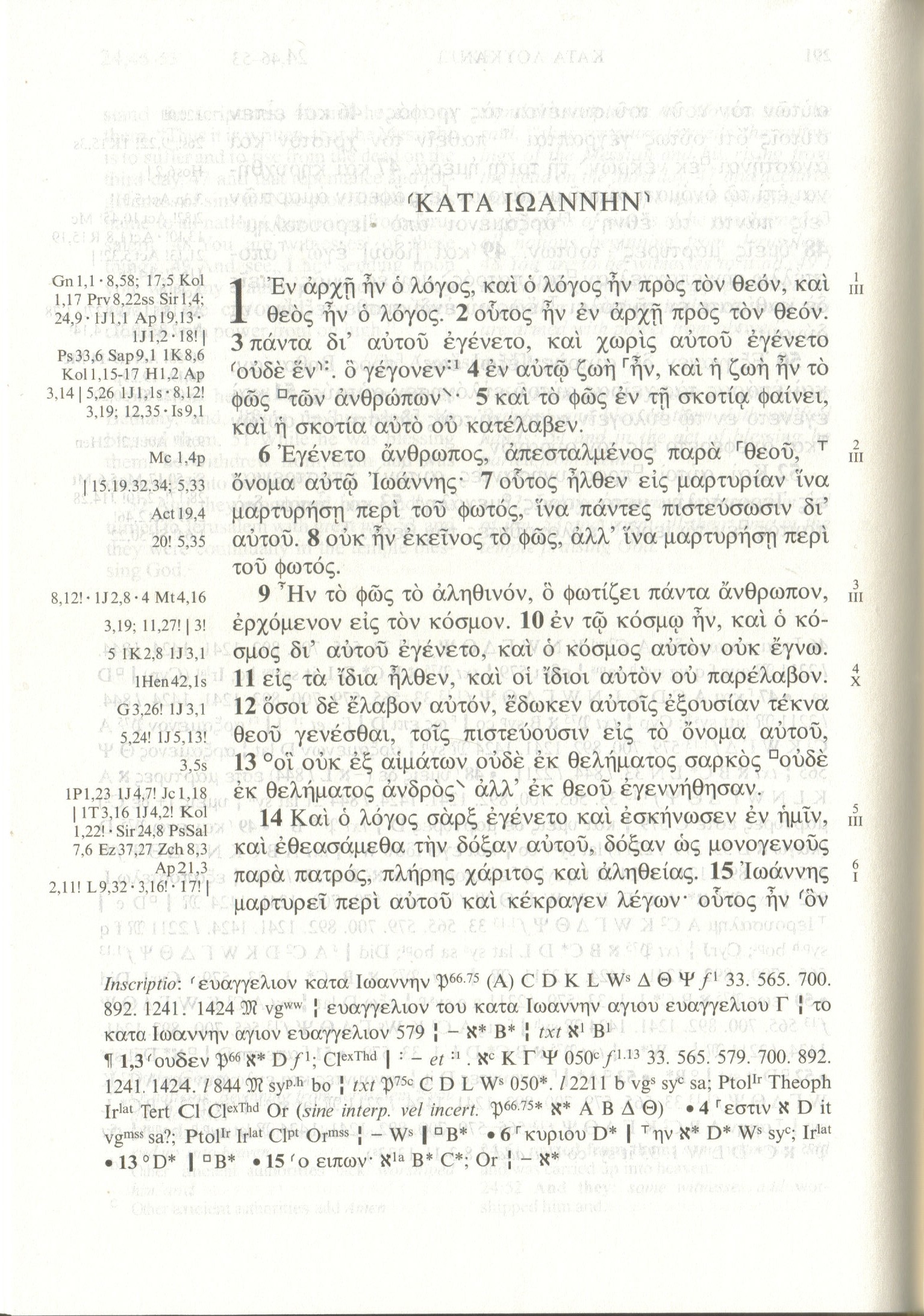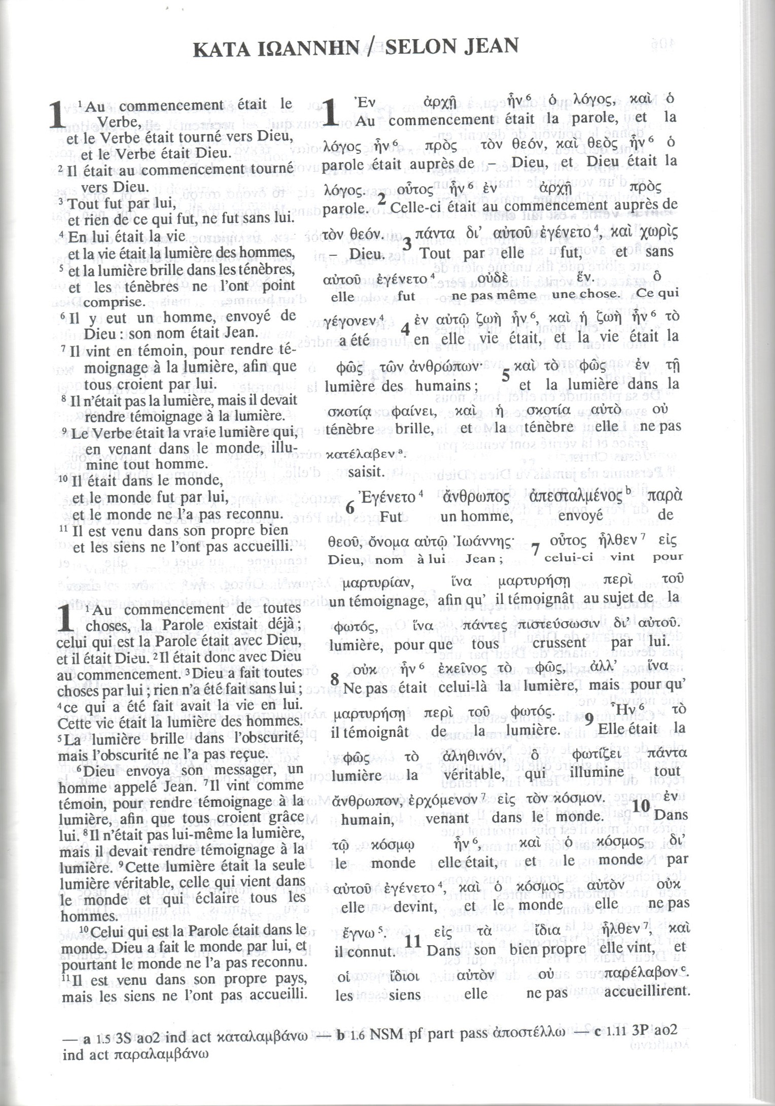 1) GNT (Texte Grec) : ἐν ἀρχῇ ἦν ὁ λόγος, καὶ ὁ λόγος ἦν πρὸς τὸν θεόν, καὶ θεὸς ἦν ὁ λόγος.