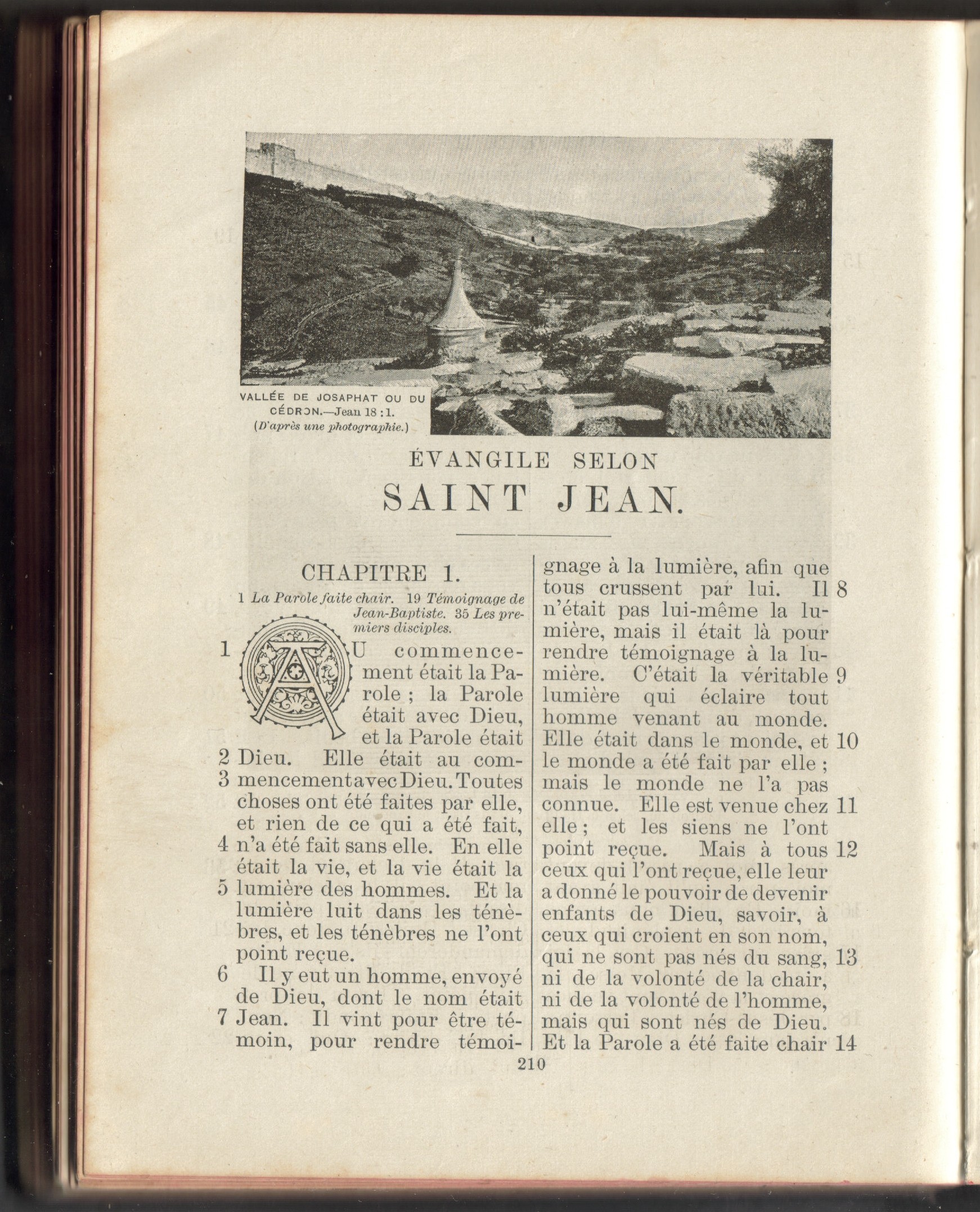D) En bas à gauche (FC) : Au commencement de toutes choses, la Parole existait déjà; celui qui est la parole était avec Dieu, et il était Dieu - Au commencement était le Verbe, et le Verbe était avec Dieu, et le Verbe était Dieu. (NT Louis-Claude Fillion - 1902, Paris)