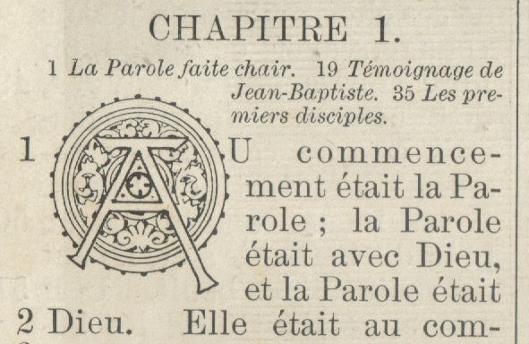 - Au commencement était le Verbe, et le Verbe était avec Dieu, et le Verbe était Dieu. (La Bible de l'abbé Genoude, 1880)