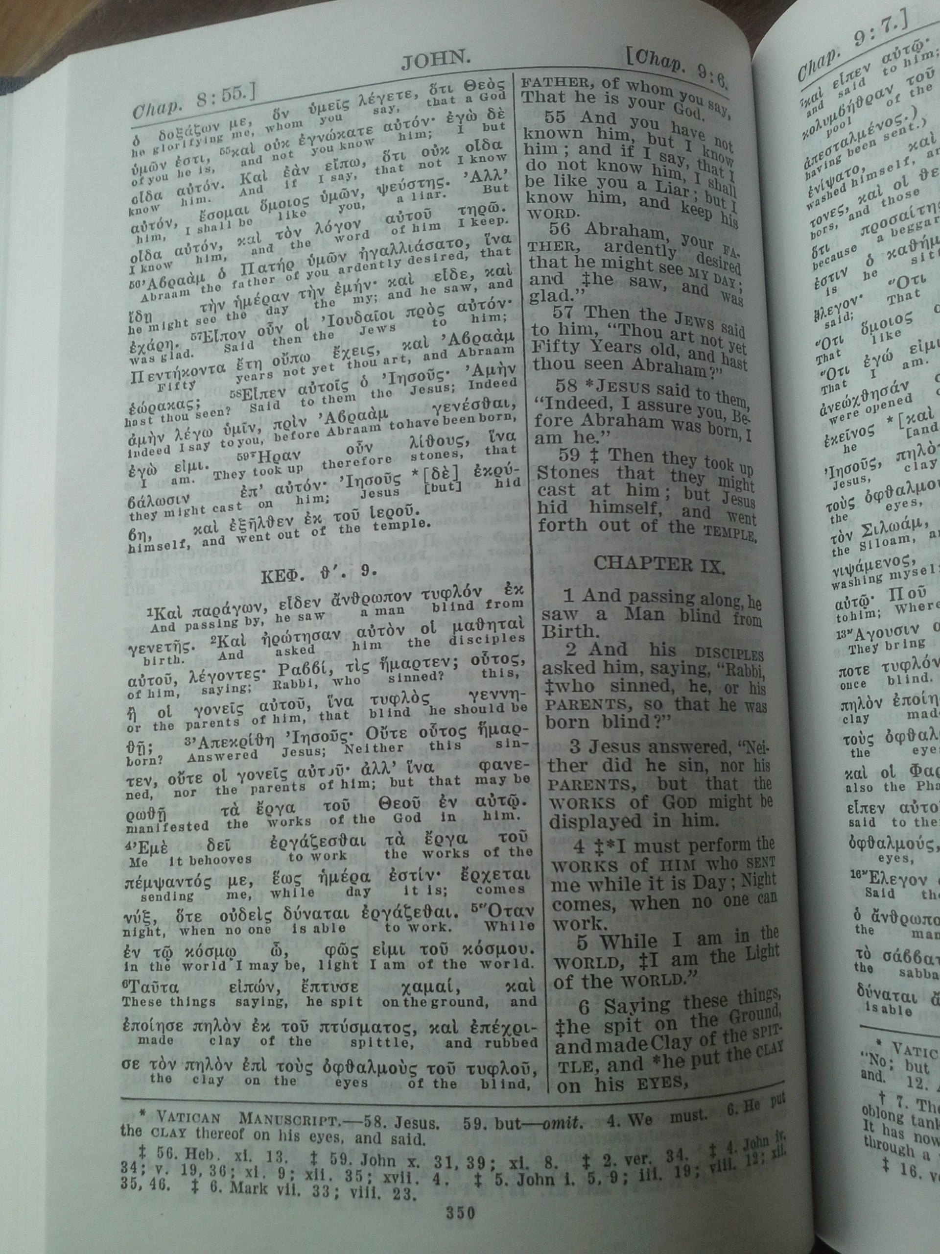 Nous voyons que dans la partie de gauche (page 350), l'expression "ego eimi" est traduite par "I am", et qu'à droite on trouve en traduction finale : "I am he" (Je suis lui)". Si vous ouvrez la traduction du monde nouveau en Deutéronome 32:39, vous verrez que cette même expression est employée pour Jéhovah.
