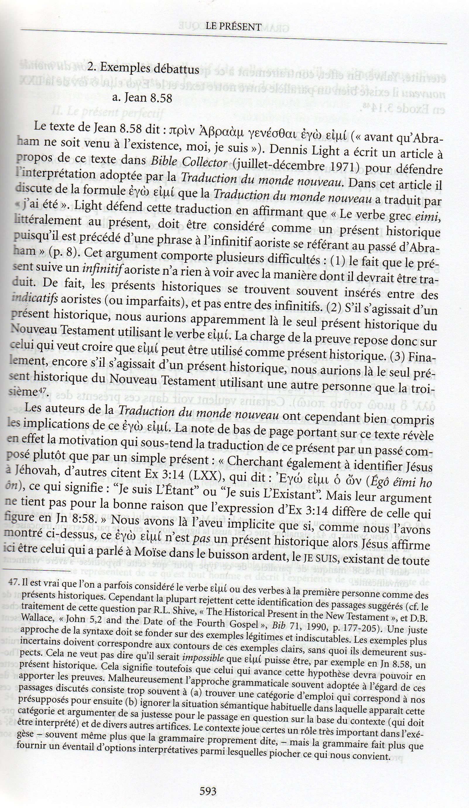 48. On aurait également pu envisager, comme le fait McKay, que ce εἰμί soit un présent du passé continué (New Syntaxt, p.42; signalons que c'est aussi la ligne adoptée en note par la version française de la Traduction du monde nouveau, quelque peu différente donc de l'hypothèse d'un présent historique soutenue par Light mais ayant là encore pour but d'esquiver le parallèle avec Ex 3.14). Cependant Jn 8.58 manque de parallèle de ce type pour que cette hypothèse s'avère vraiment convaincante.