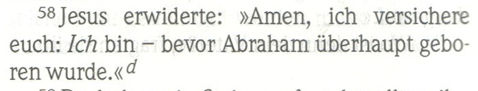 - "Amen, ich versichere euch: Ich bin - bevor Abraham überhaupt geboren wurde." (Gute Nachricht Bibel)