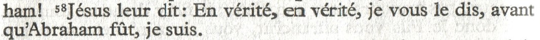 - En vérité, en vérité, je vous le dis, avant qu'Abraham fût, je suis (NT d'Edmond Stapfer)