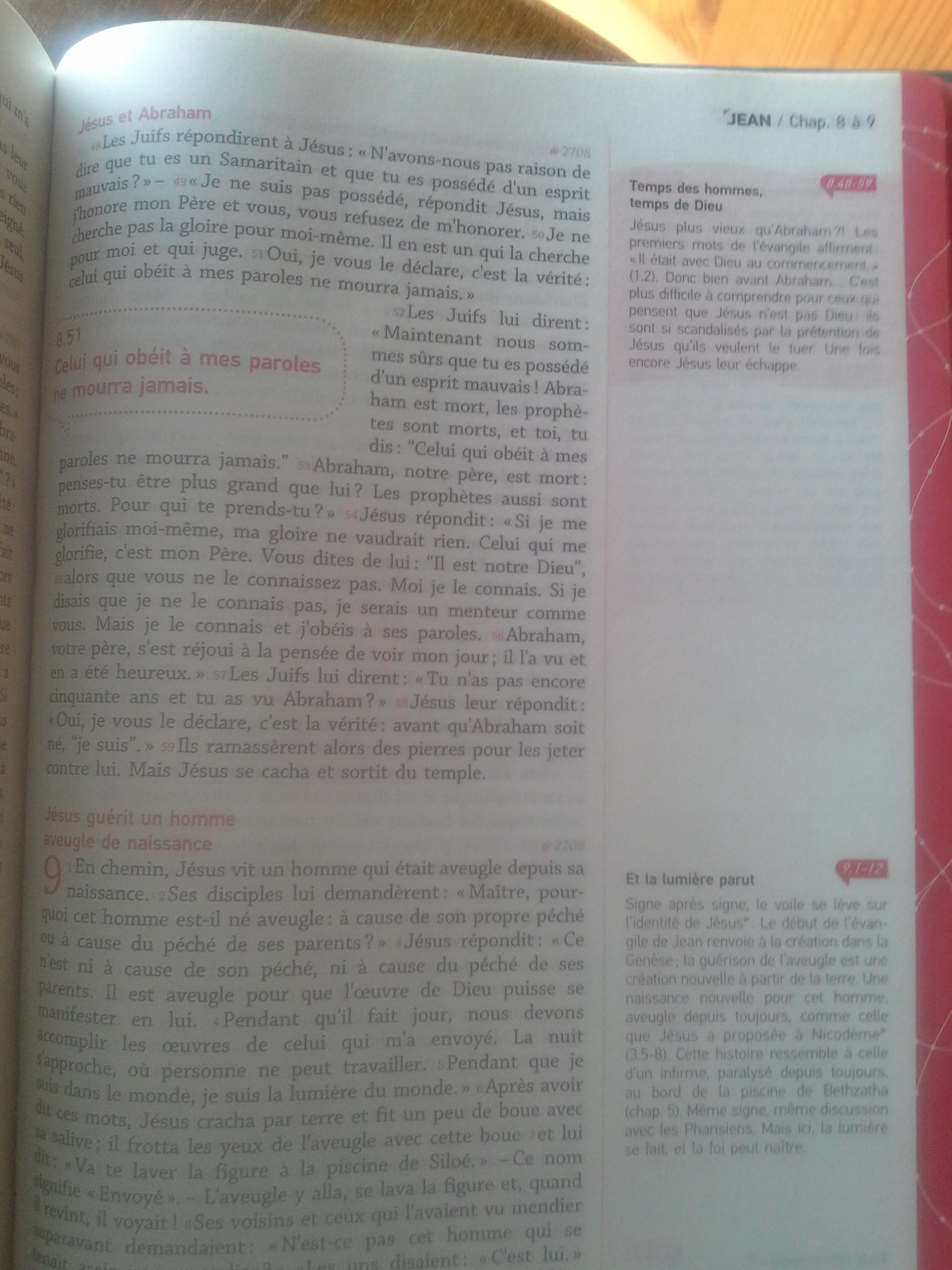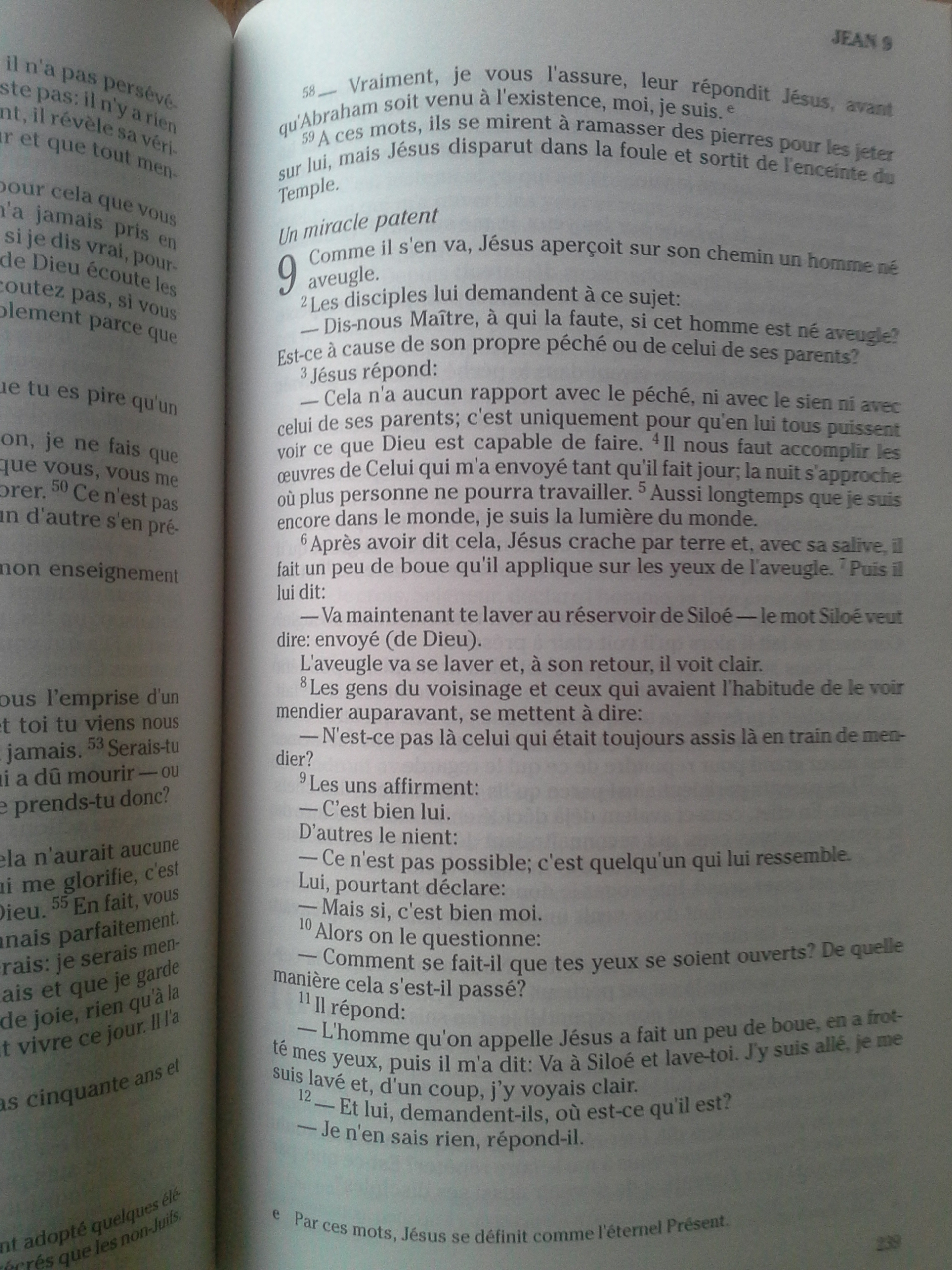 3) TOB (En haut à gauche) : Jésus leur répondit: " En vérité, en vérité, je vous le dis, avant qu'Abraham fût, Je Suis. "
