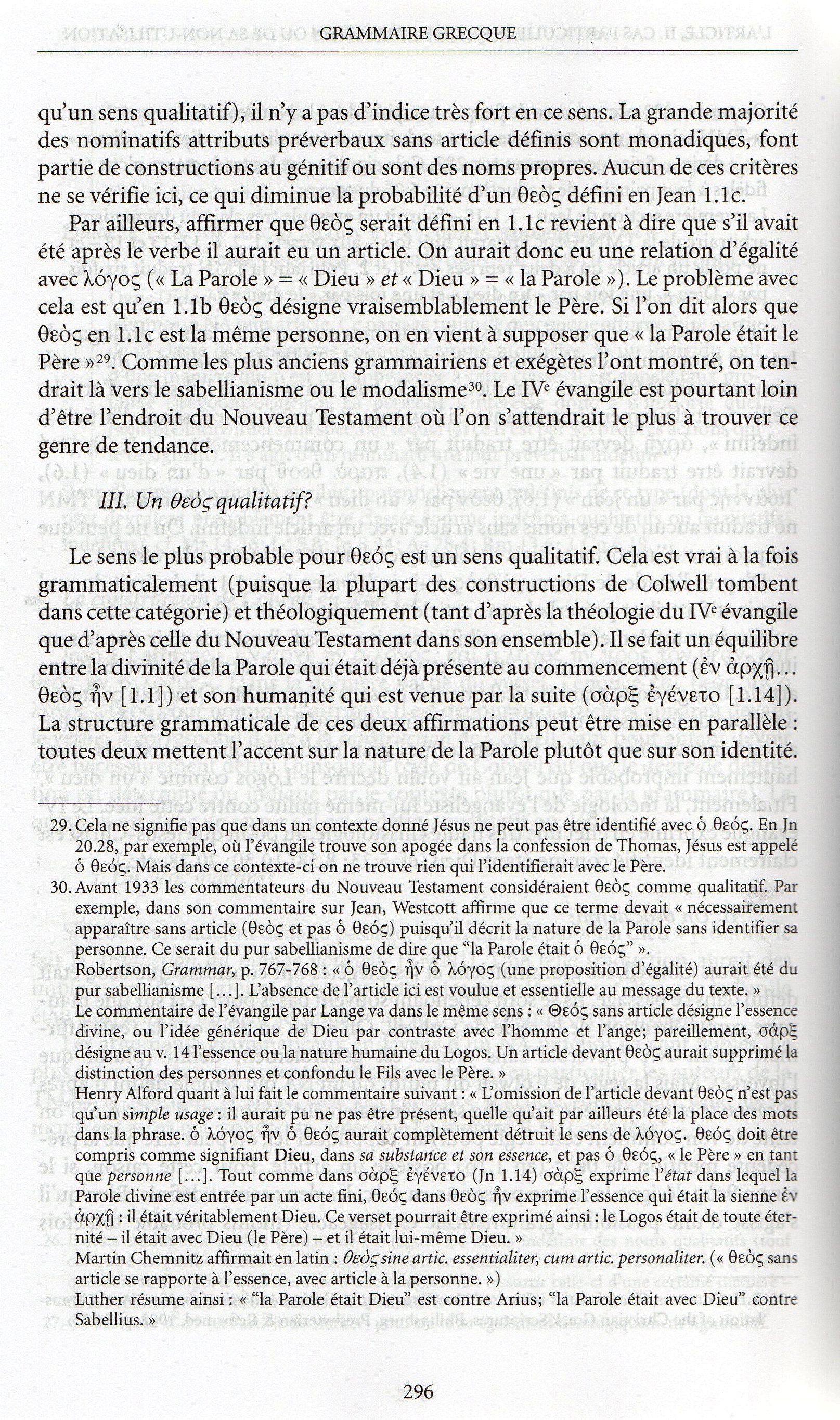 30. Avant 1933 les commentateurs du Nouveau testament considéraient θεὸς comme qualitatif. Par exemple, dans son commentaire sur Jean, Wescott affirme que ce terme devait "nécessairement apparaître sans article (θεὸς et pas ὁ θεὸς) puisqu'il décrit la nature de la Parole sans identifier sa personne. Ce serait du pur sabellianisme de dire que "la Parole était ὁ θεὸς".