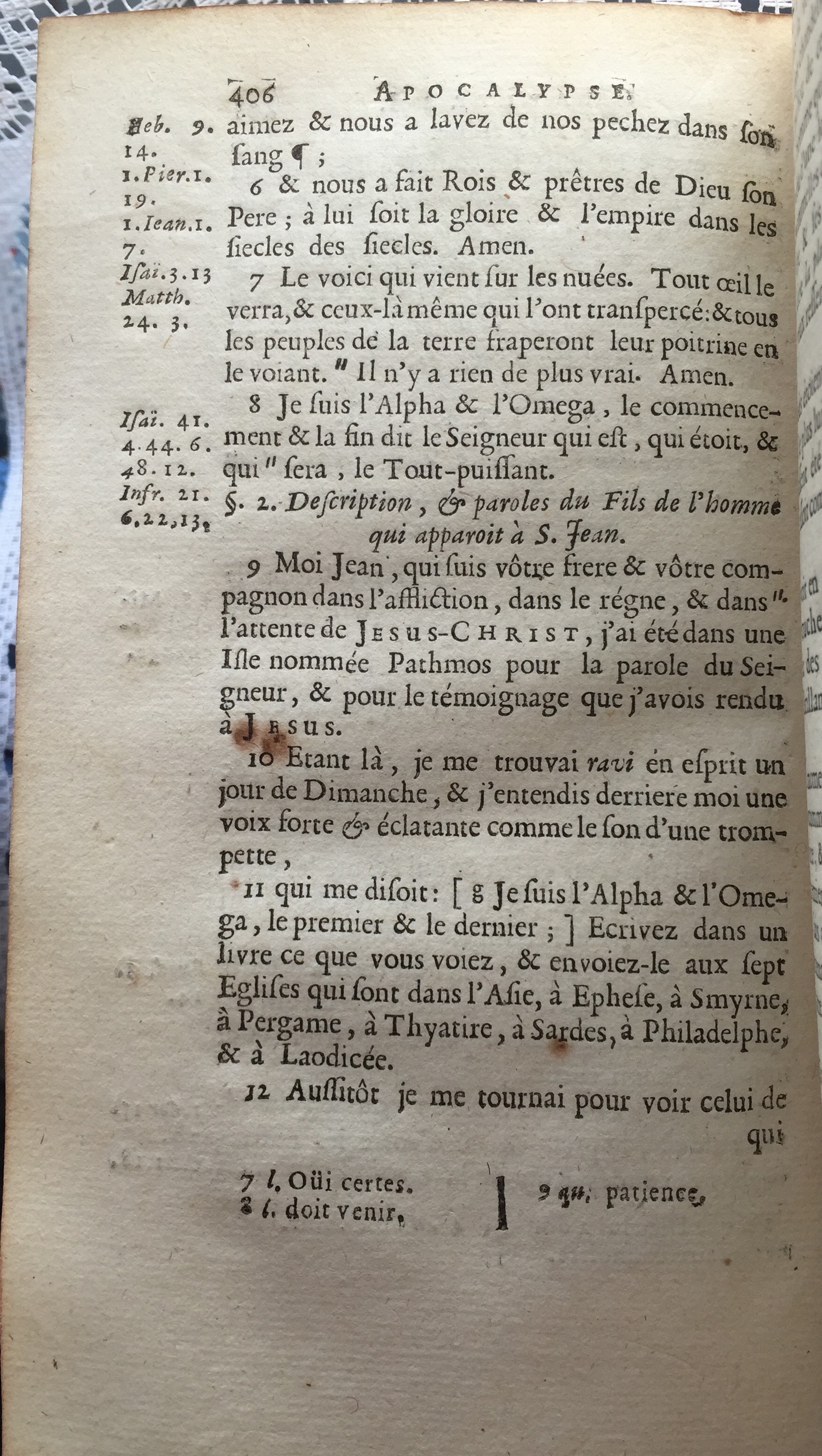 2) Traduction littérale (sous le grec) : Moi je suis l'alpha et l'oméga, dit le Seigneur - Dieu, le étant et le il était et le venant, le tout-puissant.
