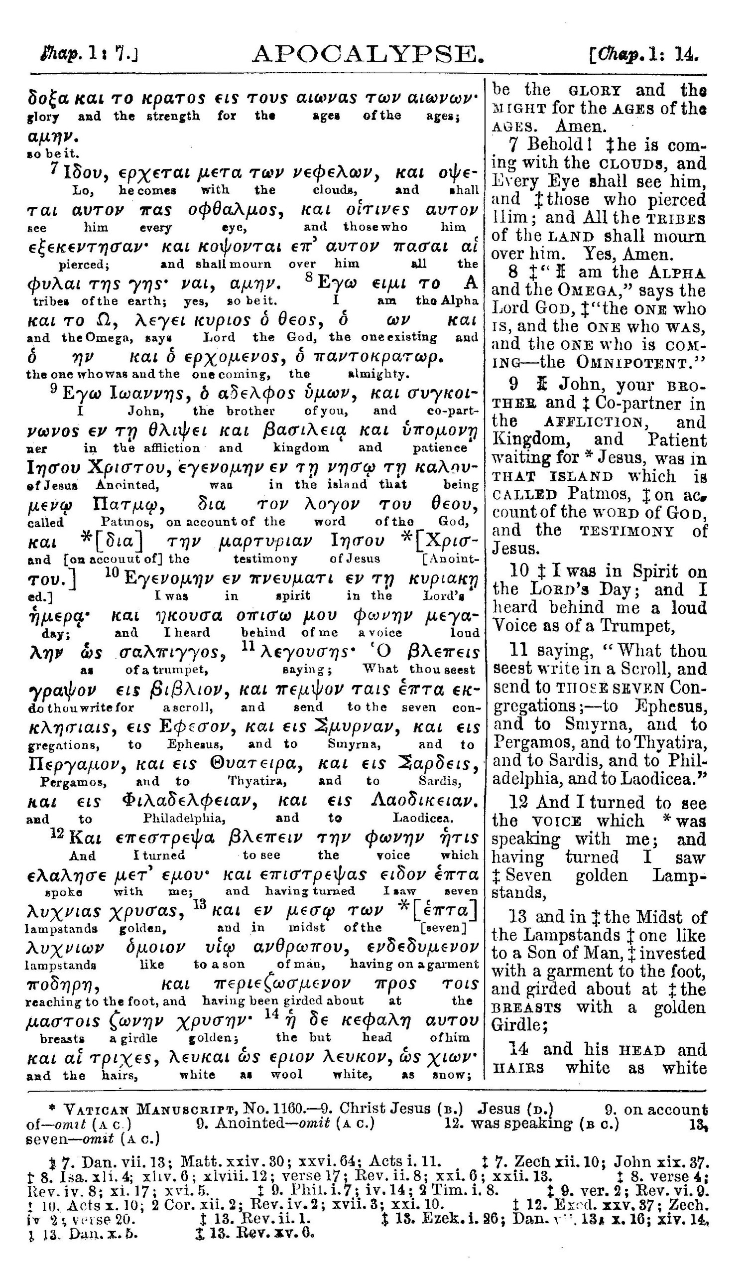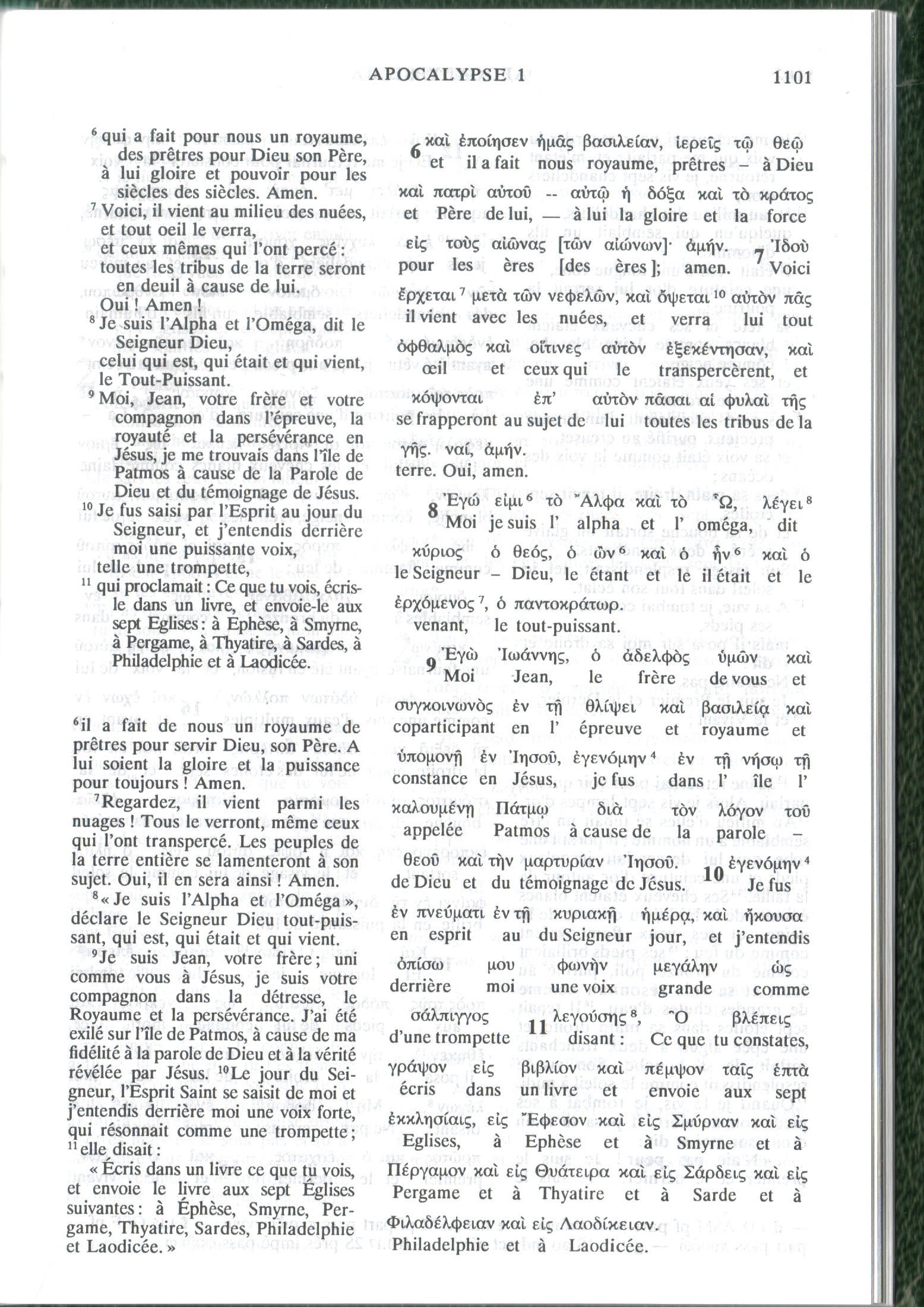 1) GNT (texte grec) : ἐγώ εἰμι τὸ ἄλφα καὶ τὸ ὦ, λέγει κύριος ὁ θεός, ὁ ὢν καὶ ὁ ἦν καὶ ὁ ἐρχόμενος, ὁ παντοκράτωρ.