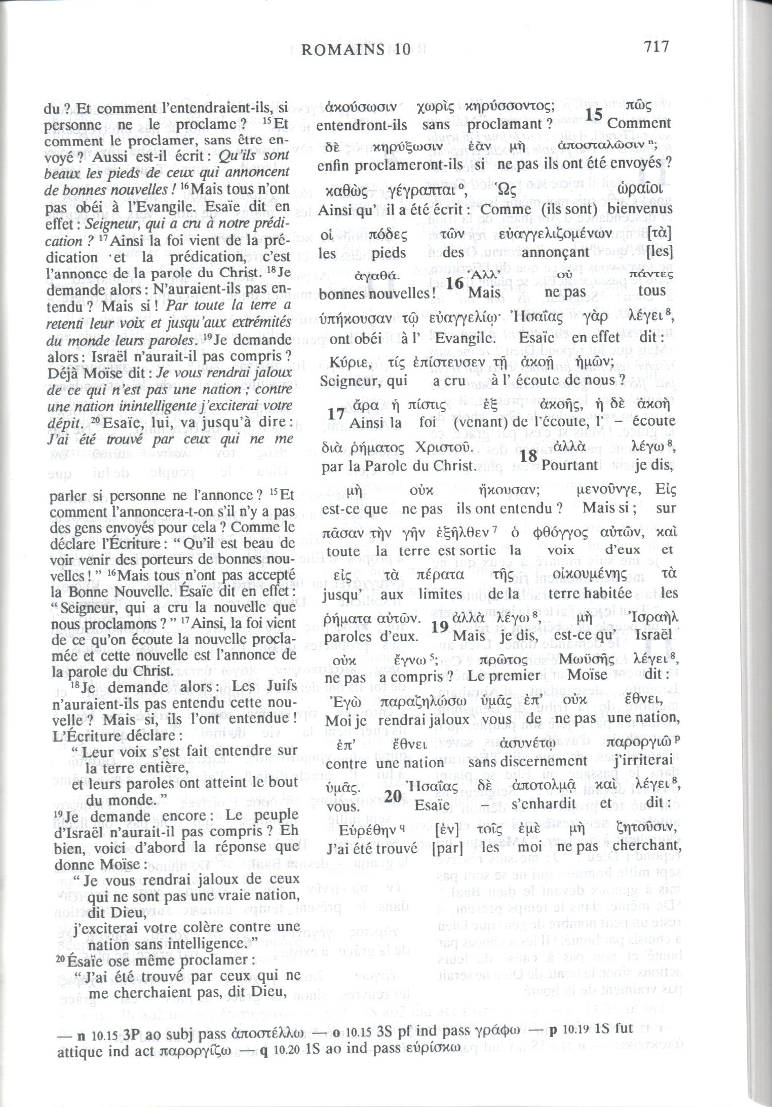 1) GNT (Texte Grec) : ἄρα ἡ πίστις ἐξ ἀκοῆς, ἡ δὲ ἀκοὴ διὰ ῥήματος χριστοῦ.