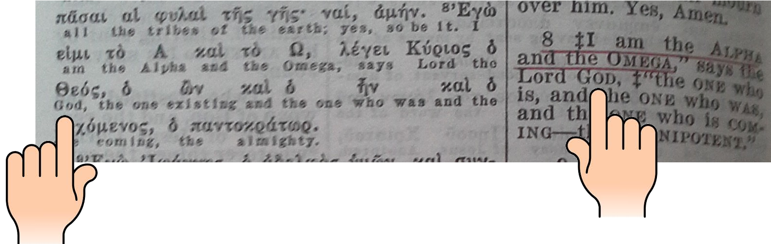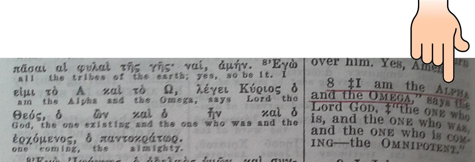 Voici dans la Diaglott, le verset de Révélation 1:8, suivi de l'Alphabetical Appendix, page 872, qui identifie l'Alpha et l'Oméga de Révélation 1:8.