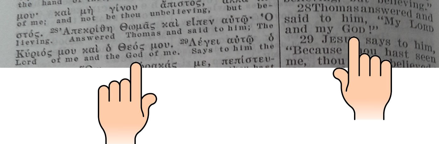 Il y a un détail à soulever dans cette page. S'il est vrai que la traduction appropriée est : "la Parole était Dieu" (was God), on remarquera qu'à gauche sous les mots grecs "καὶ Θεὸς ἦν ὁ Λόγος", il est écrit "and a god (un dieu) was the Word". Cela s'explique par le fait qu'à gauche, il s'agit simplement d'un rendu "mot à mot". En fait, la traduction se trouve à droite. Il faut savoir qu'une traduction tient compte d'un certain nombre de paramètres (contexte, grammaire, etc.)