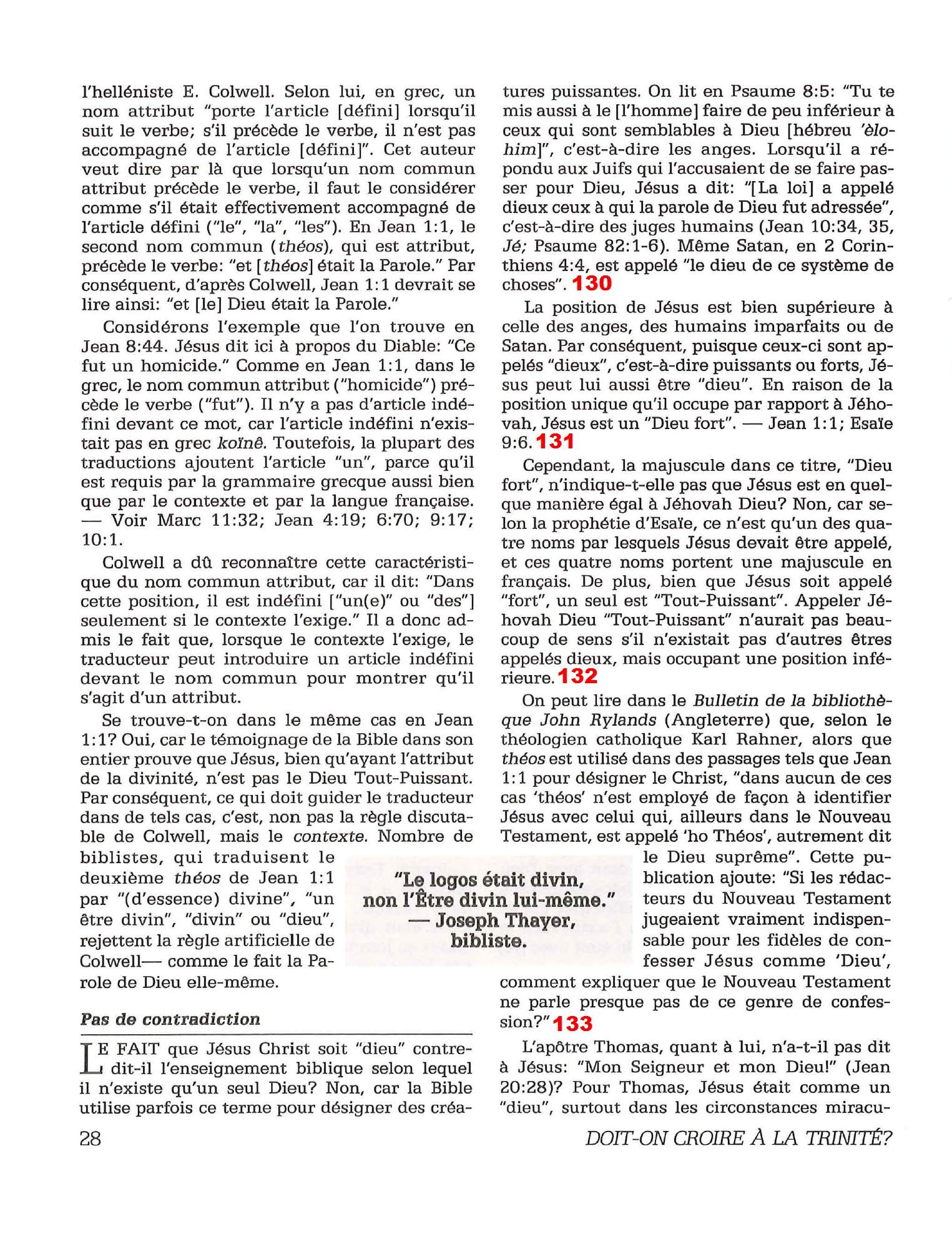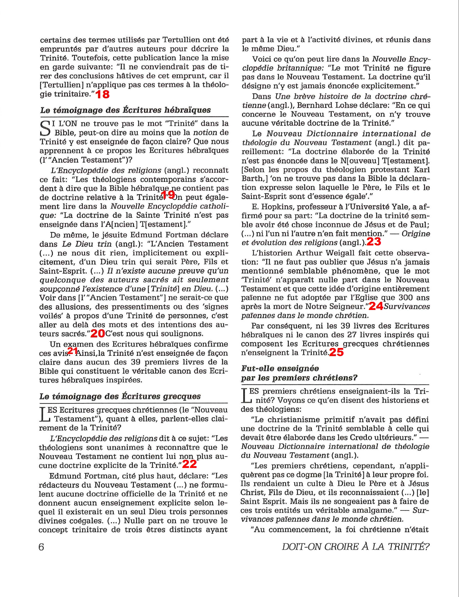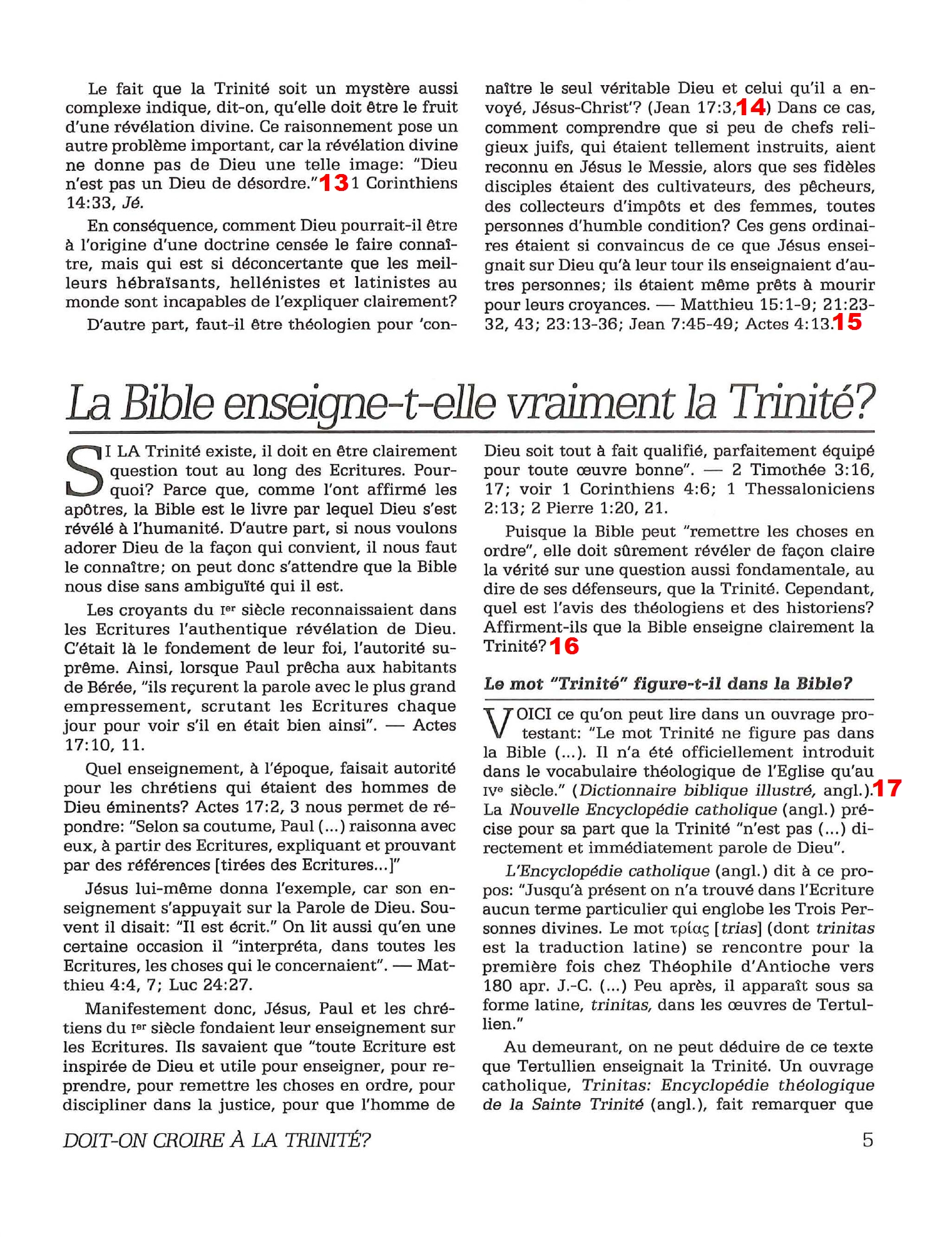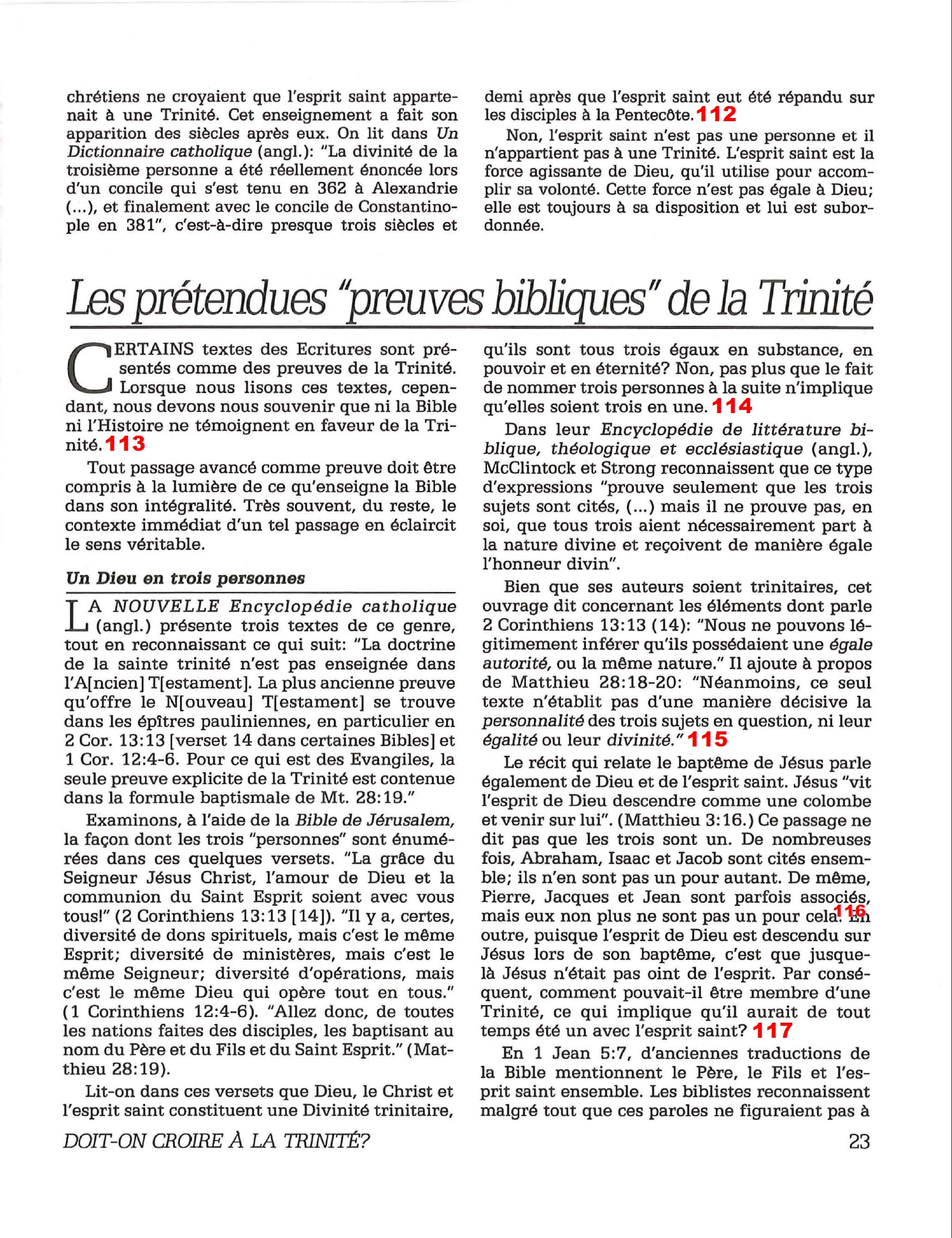 Introduction «Doit-on-croire à la Trinité?» est un pamphlet issu de la Tour de Garde (Watchtower society) publié en 1989 et qui attaque frontalement la Trinité, c’est-à-dire l’idée d’un Dieu unique en trois personnes (Père, Fils et St Esprit) qui est la marque distinctive du Christianisme. Cette brochure a été distribuée à 5 millions d’exemplaires, ce qui est tout simplement gigantesque, et j’ai été amené à la lire moi-même en 2014, lorsqu’un collègue Témoin de Jéhovah me l’a passé pour «m’amener à la vérité». Je remercie le Seigneur d’avoir déjà étudié le sujet auparavant, car les arguments contenus dans ce pamphlet sont les meilleurs que l’Organisation des Témoins de Jéhovah a pu apporter. Aujourd’hui, je me suis senti amené à écrire cette «contre-brochure» sous la forme de notes en bas de page du texte original. J’ai fait ce choix pour trois raisons :