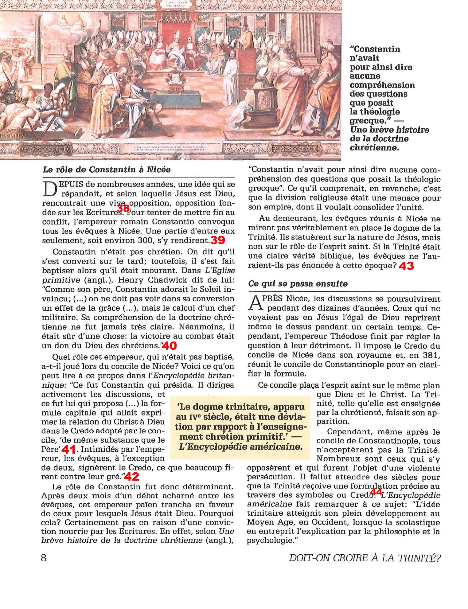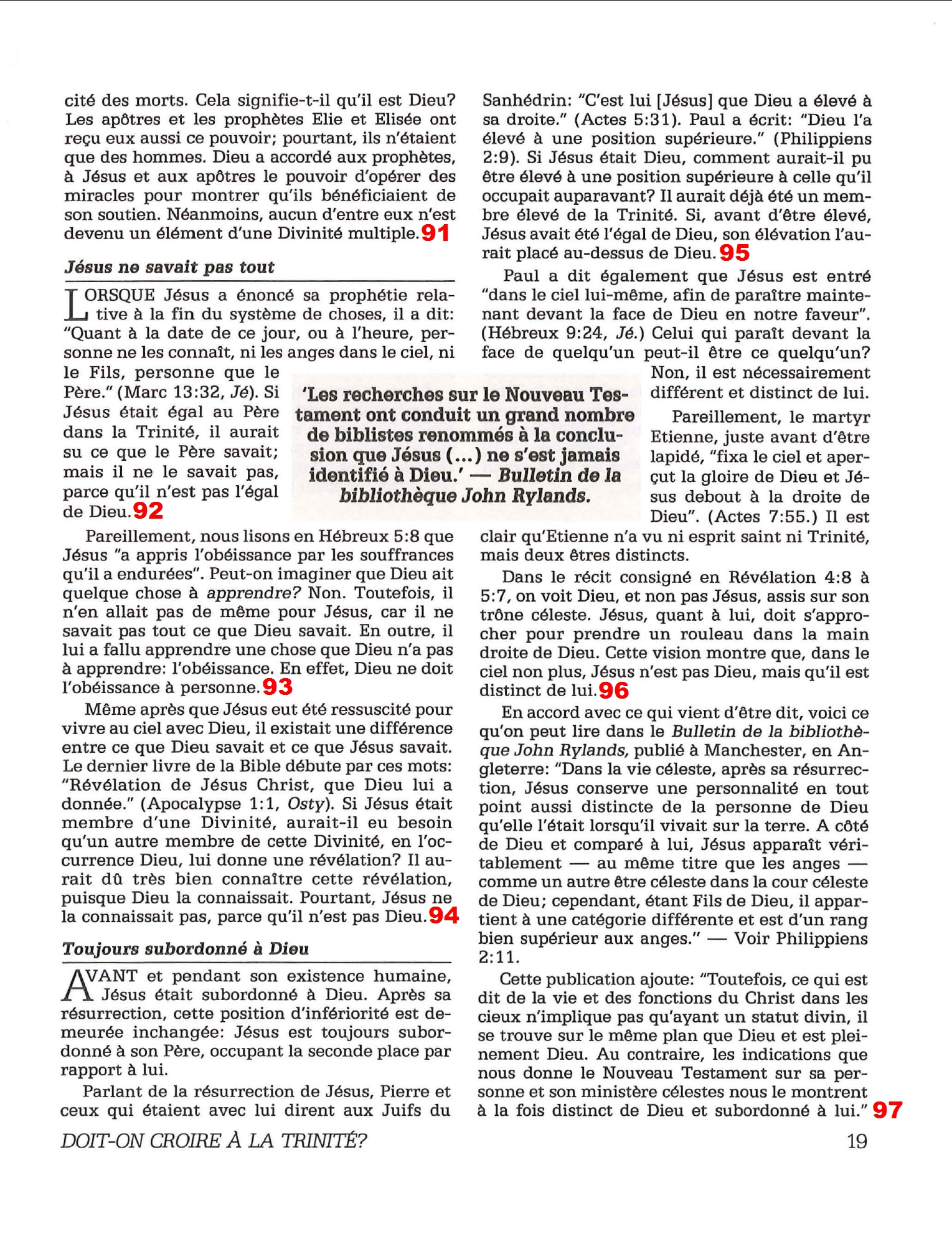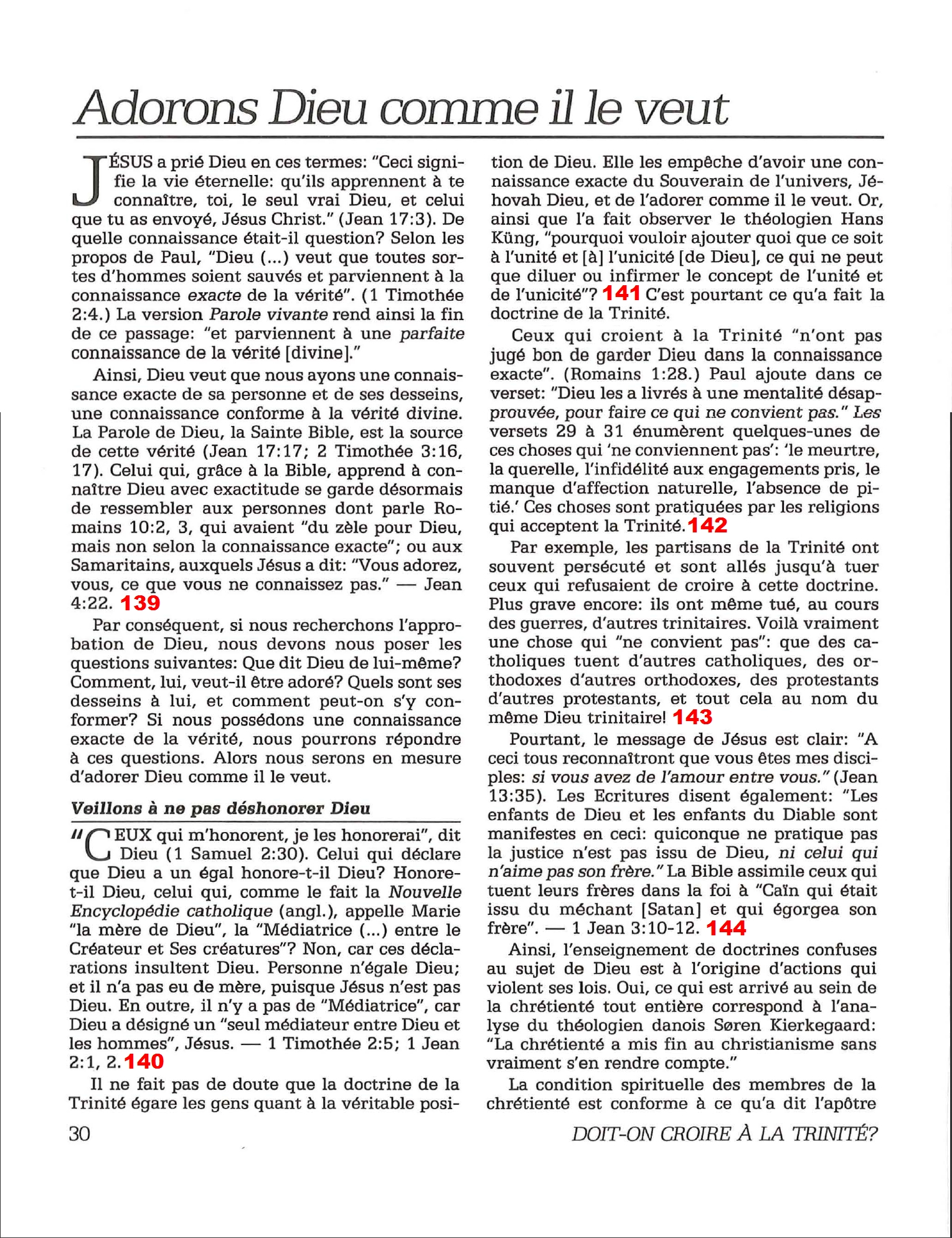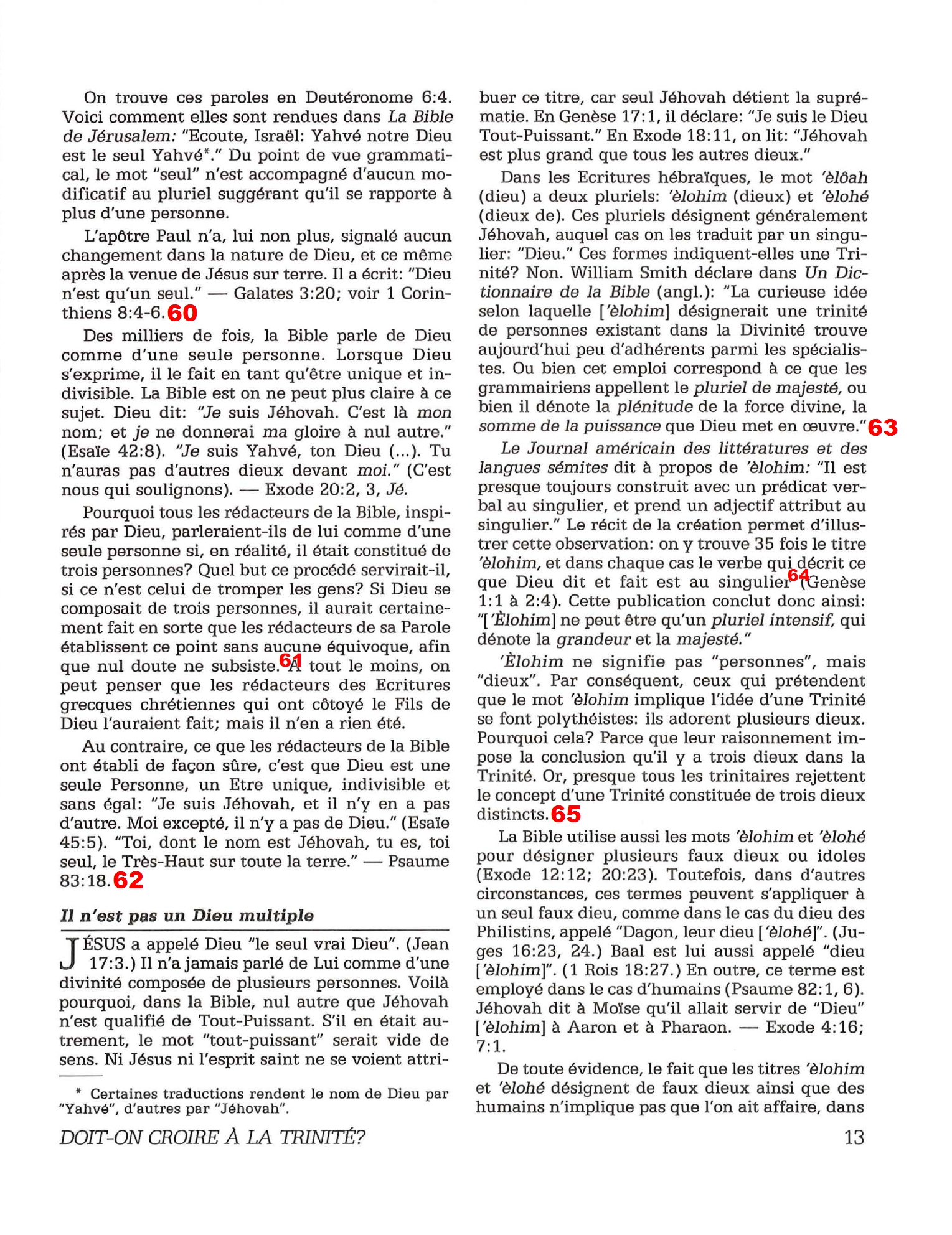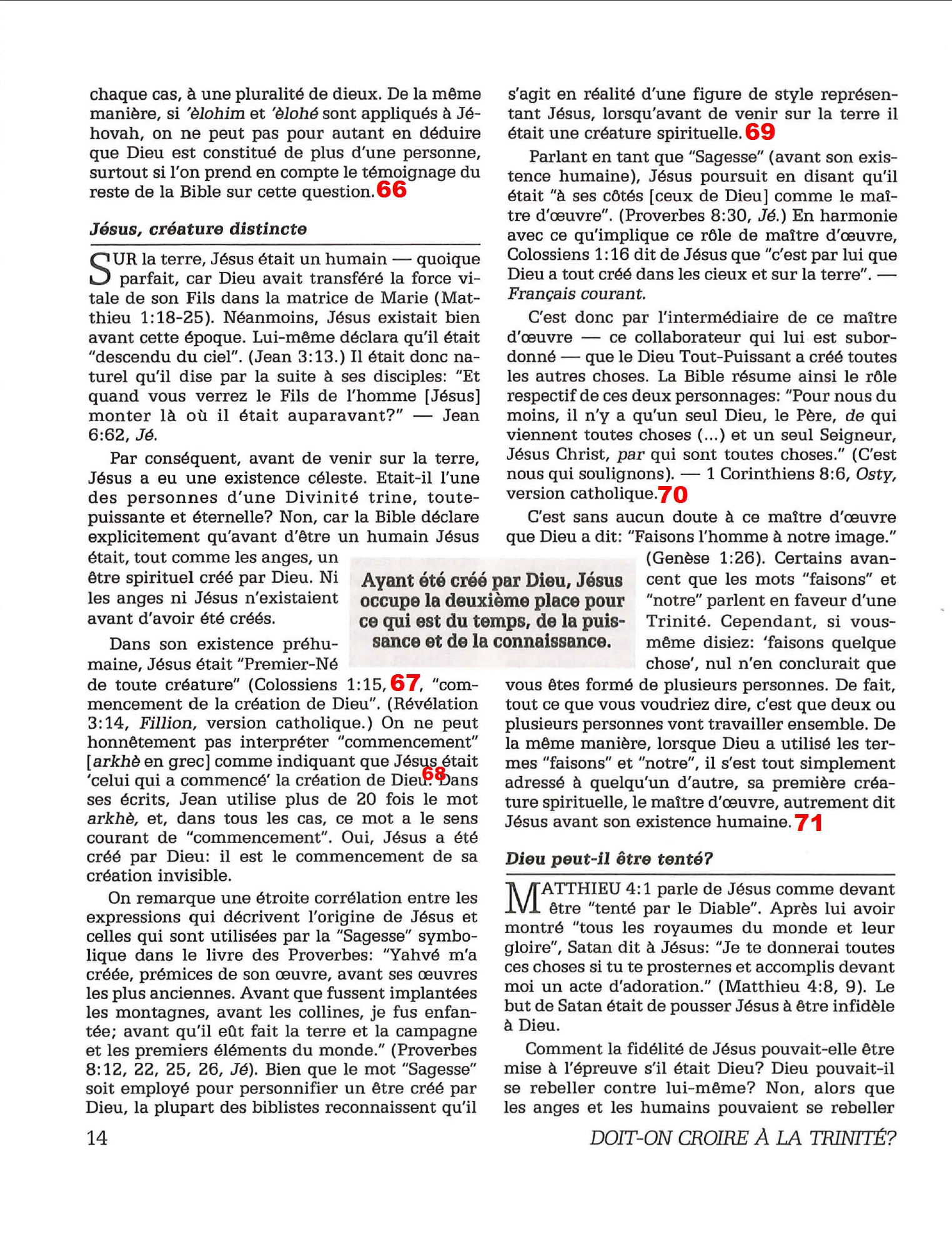 Introduction «Doit-on-croire à la Trinité?» est un pamphlet issu de la Tour de Garde (Watchtower society) publié en 1989 et qui attaque frontalement la Trinité, c’est-à-dire l’idée d’un Dieu unique en trois personnes (Père, Fils et St Esprit) qui est la marque distinctive du Christianisme. Cette brochure a été distribuée à 5 millions d’exemplaires, ce qui est tout simplement gigantesque, et j’ai été amené à la lire moi-même en 2014, lorsqu’un collègue Témoin de Jéhovah me l’a passé pour «m’amener à la vérité». Je remercie le Seigneur d’avoir déjà étudié le sujet auparavant, car les arguments contenus dans ce pamphlet sont les meilleurs que l’Organisation des Témoins de Jéhovah a pu apporter. Aujourd’hui, je me suis senti amené à écrire cette «contre-brochure» sous la forme de notes en bas de page du texte original. J’ai fait ce choix pour trois raisons :