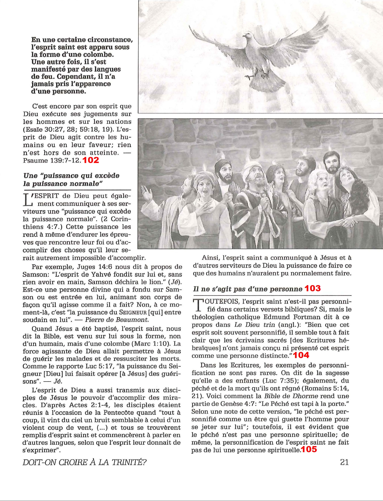 107. Et lorsqu’il est écrit que Jésus est la tête de l’Eglise, n’est-t-il donc qu’une tête ? Ne peut-t-on pas admettre un peu de symbolisme dans le langage lorsqu’on parle du St Esprit ? 108. Pas toujours aussi simple, comme par exemple dans Actes 13.2 «Pendant qu'ils servaient le Seigneur dans leur ministère et qu'ils jeûnaient, le Saint-Esprit dit : Mettez-moi à part Barnabas et Saul pour l'oeuvre à laquelle je les ai appelés»