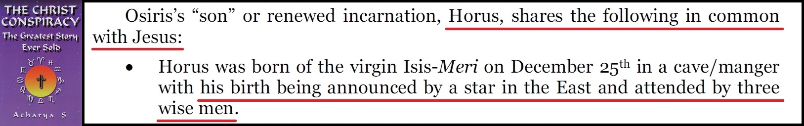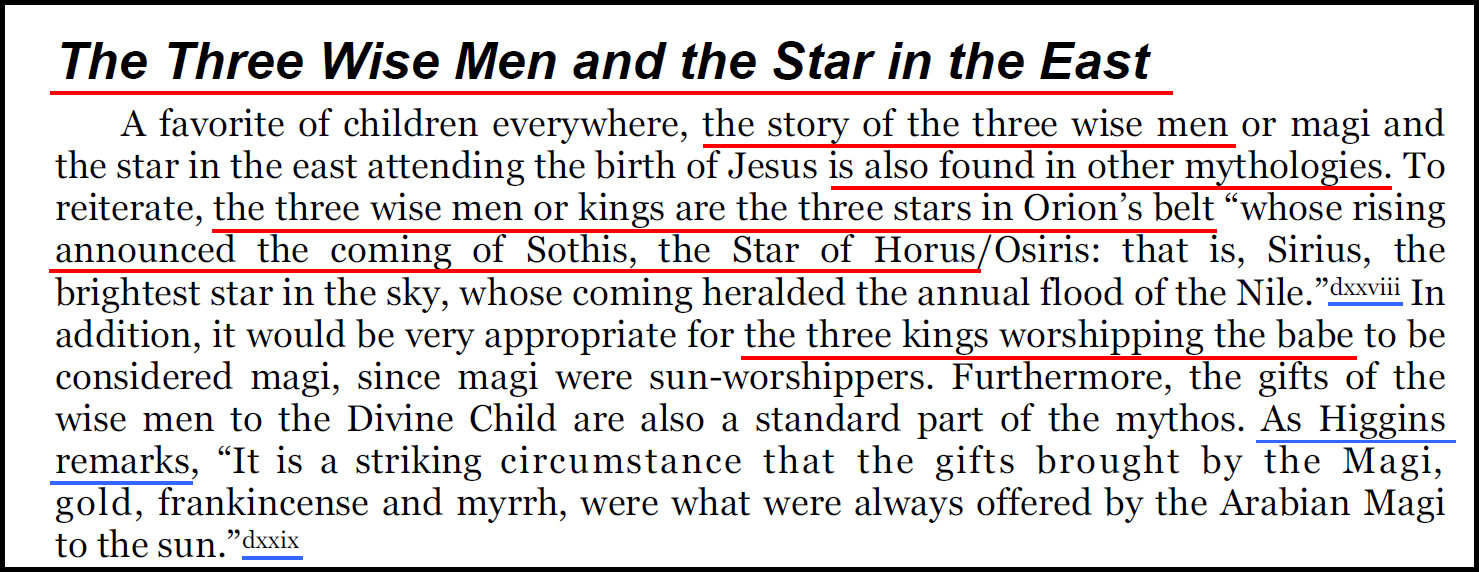 Ainsi, ces faits démontrent l'inverse de ce que Zeitgeist véhicule. À savoir que les francs-maçons et autres occultistes ont repris ces expressions d’origine chrétienne « Trois rois mages, étoile qui les guide » pour construire un récit astronomique — puis le présentent comme s’il s’agissait d’un mythe égyptien antérieur (Horus, l'étoile de l'Est et les trois rois mages).