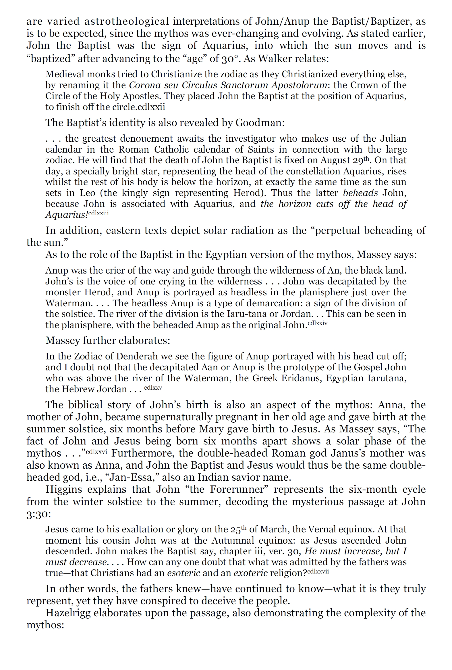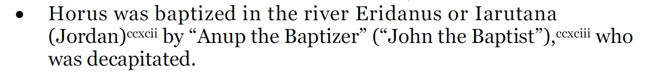 Cette autrice pour le moins antichrist nous disait qu'Horus a été baptisé par « Anup le baptiseur », dans une rivière incertaine. Une référence en chiffres romains nous est donné. (ccxciii)