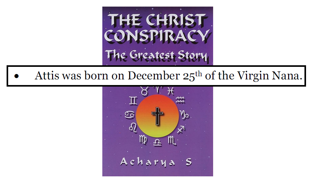 Peter Joseph n’étaye pas cette affirmation par une source phrygienne ou grecque. Or, on ne dispose pas de texte antique attestant une naissance d’Attis fixée au 25 décembre.