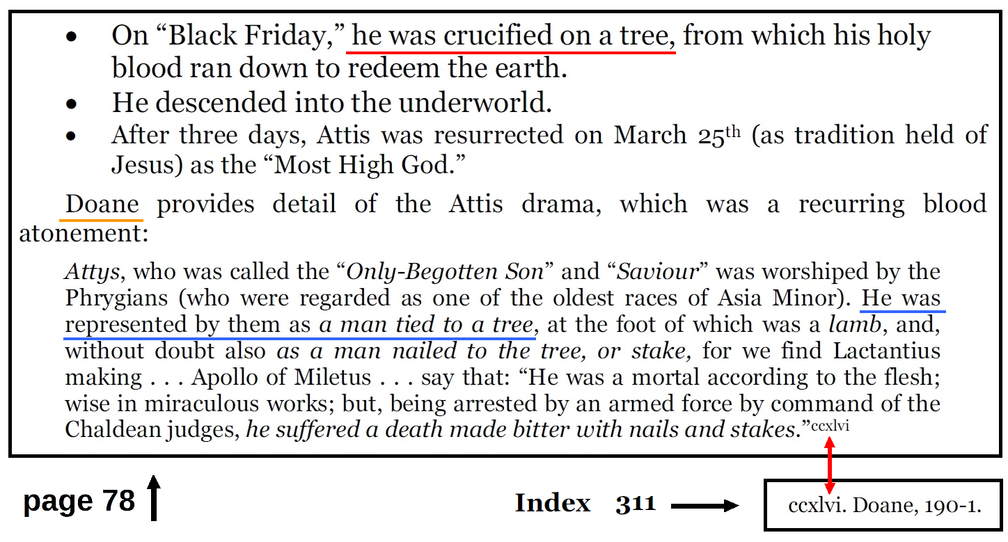Le problème, c’est que l’autrice fait preuve de malhonnêteté en dénaturant une citation qu’elle reprend chez Doane. Comparez (dans la citation qu'on vient de voir au-dessus) ce qui est souligné en rouge avec ce qui est en bleu : à propos du culte d’Attis chez les Phrygiens, Doane écrit qu’il est représenté comme un homme attaché à un arbre — “He was represented by them as a man tied to a tree.” On parle donc d’une représentation, pas d’une personne réelle ; attaché, et non crucifié. Or l’autrice (Acharya S) transforme cela en : “he was crucified on a tree.”