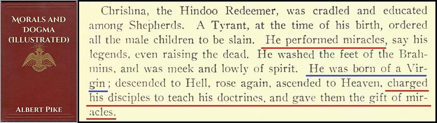 L'enseignement de Zeitgeist au sujet des miracles de Krishna et de ses disciples, a pour origine ce livre d'Albert Pike. Les deux citations soulignées en rouge. Et pile au milieu en bleu, on a la référence manquante qu'Acharya S avait malencontreusement perdue (Voir ici).