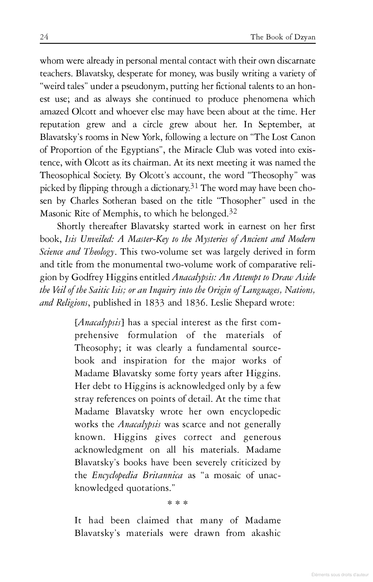 Le fait qu'Helena Blavatsky à développé la théosophie à partir de l'oeuvre du franc-maçon Godfrey Higgins est confirmée dans la préface du livre « The Book of Dzyan », aux pages 24 et 25.