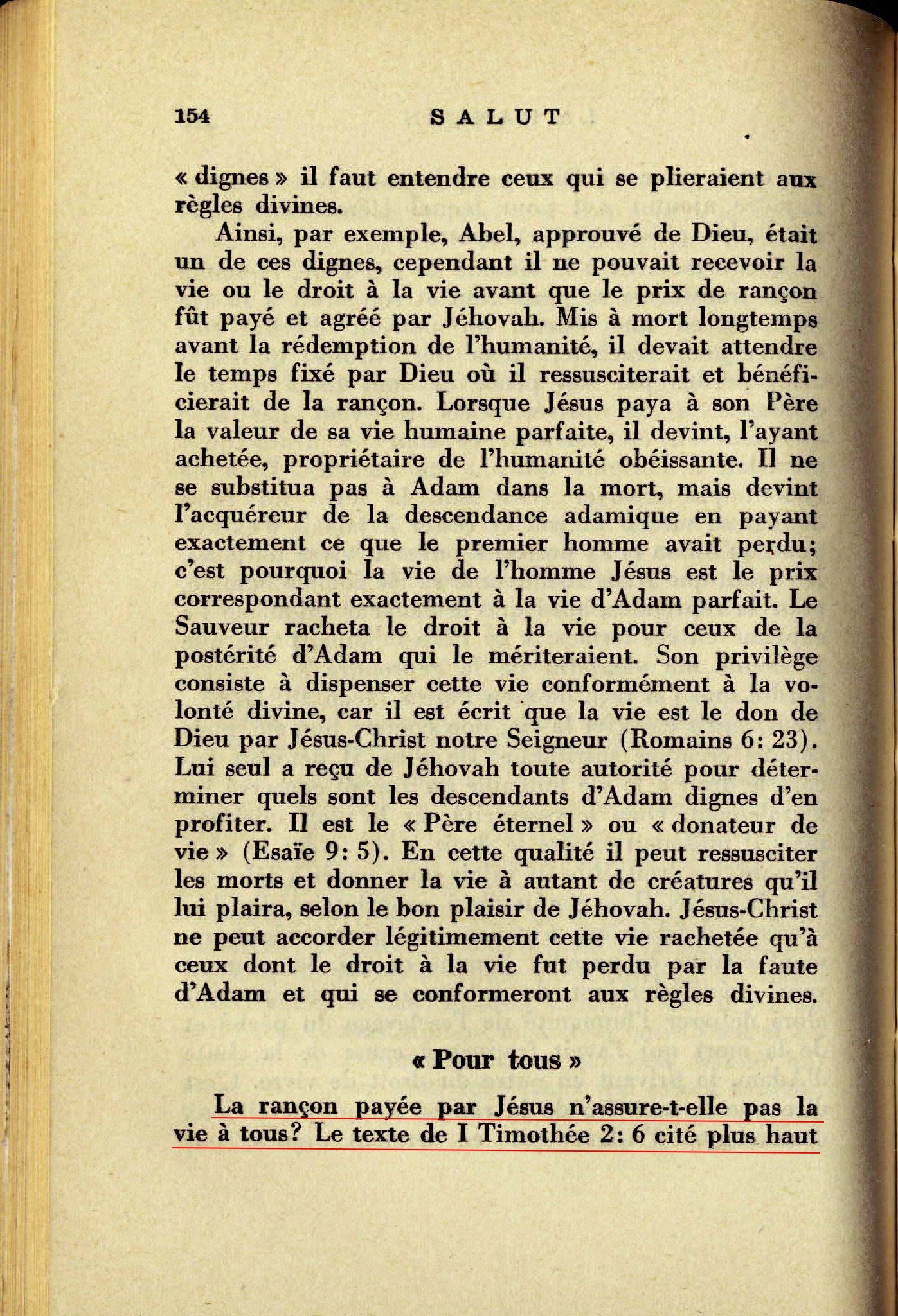 La rançon payée par Jésus n'assure-t-elle pas la vie à tous ? Le texte de 1 Timothée 2:6 cité plus haut n'établit-il pas que Jésus mourut pour toute l'humanité ? Ce verset n'est-il pas pour la race humaine une garantie que chacun bénéficiera de la rançon ? Non, cette conclusion n'est pas juste. Beaucoup d'hommes sont volontairement méchants: ceux-là n'ont rien à attendre de Dieu Source : 🇫🇷 Salut (1939), page 154, page 155 + Cover |