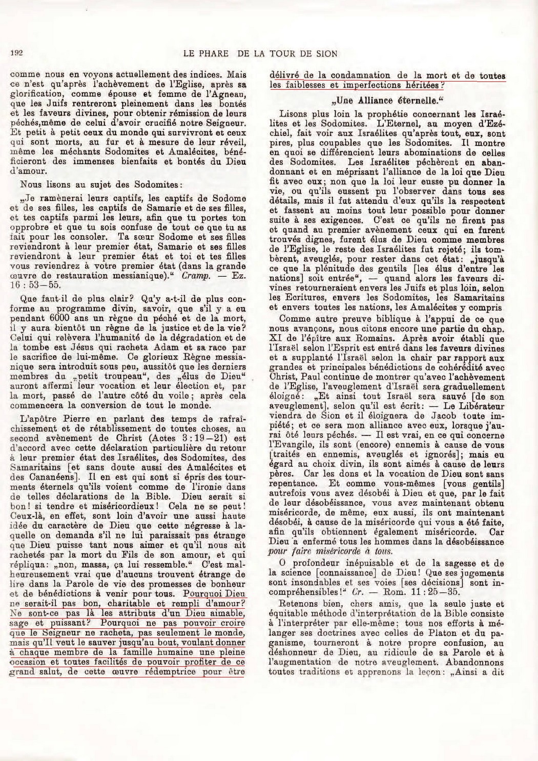 Ne sont-ce pas là les attributs d'un Dieu aimable, sage puissant ? Pourquoi ne pas pouvoir croire que le Seigneur ne racheta, pas seulement le monde, mais qu'Il veut le sauver jusqu'au bout, voulant donner à chaque membre de la famille humaine une pleine occasion et toutes facilités de pouvoir profiter de ce grand salut, de cette oeuvre rédemptrice pour être délivré de la condamnation de la mort et de toutes les faiblesses et imperfections héritées ? Source : 🇫🇷 Le Phare de la Tour de Sion, Décembre 1908, page 192 |