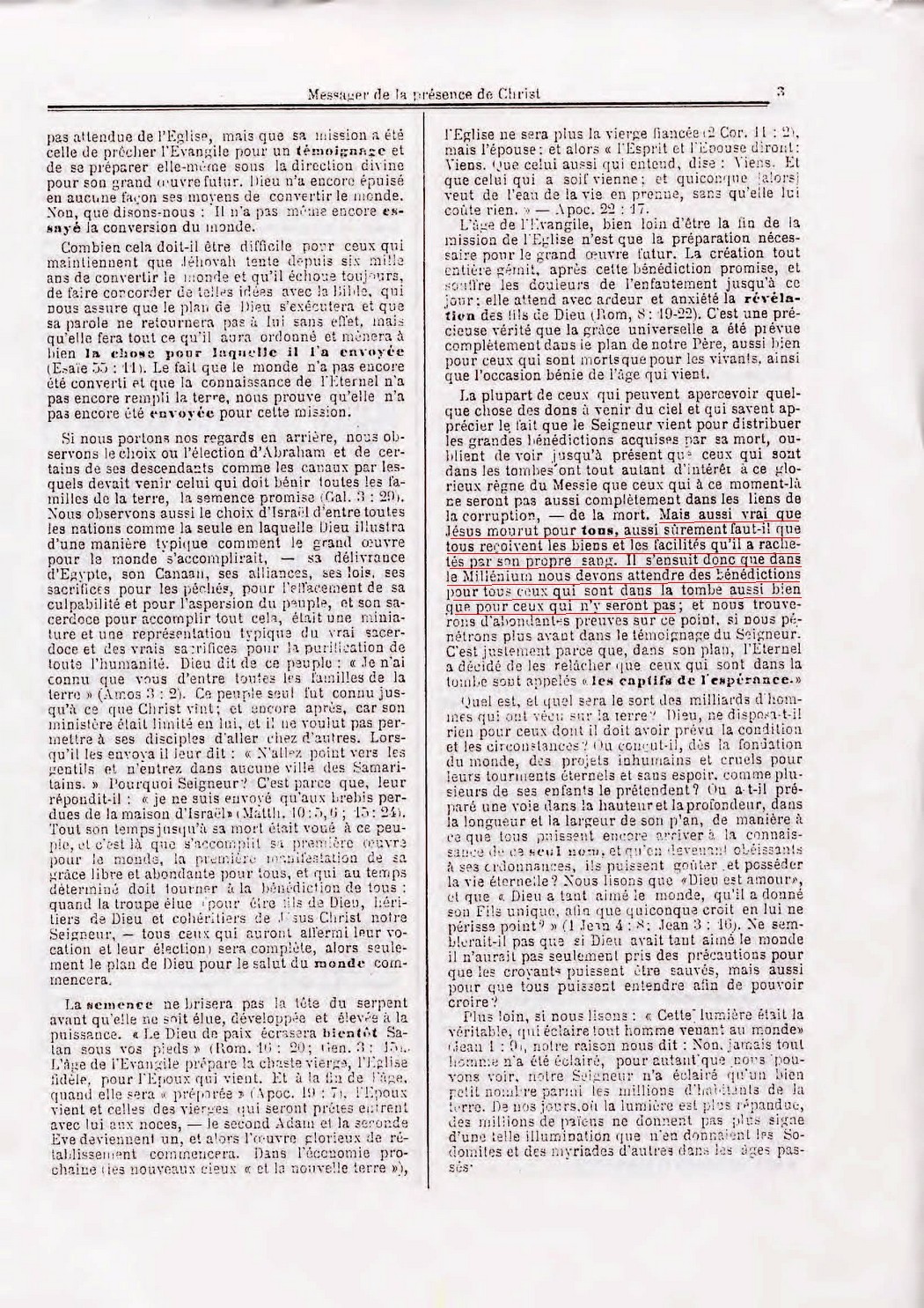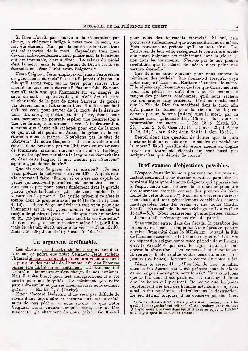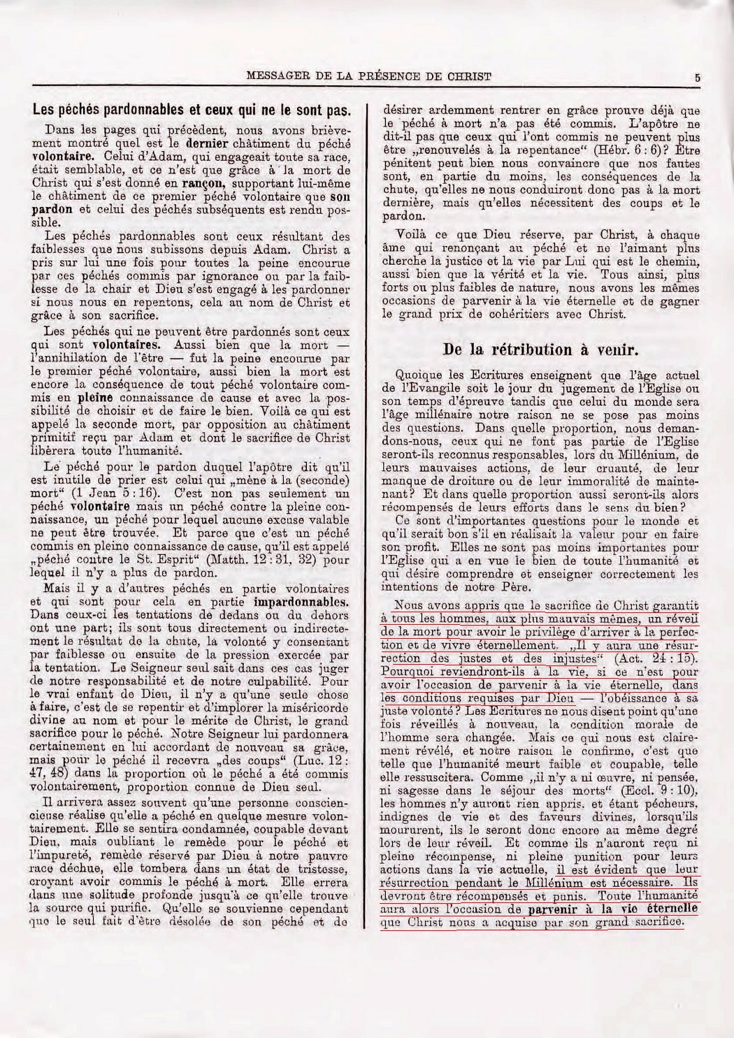Nous avons appris que le sacrifice de Christ garantit à tous les hommes, aux plus mauvais mêmes, un réveil de la mort pour avoir le privilège d'arriver à la perfection et de vivre éternellement. "Il y aura une résurrection des justes et des injustes" (Act. 24.15). Pourquoi reviendront-ils à la vie, si ce n'est pour avoir l'occasion de parvenir à la vie éternelle, dans les conditions requises par Dieu... il est évident que leur résurrection pendant le Millénium est nécessaire. Ils devront être récompensés et punis. Toute l'humanité aura alors l'occasion de parvenir à la vie éternelle que Christ nous a acquise par son grand sacrifice.