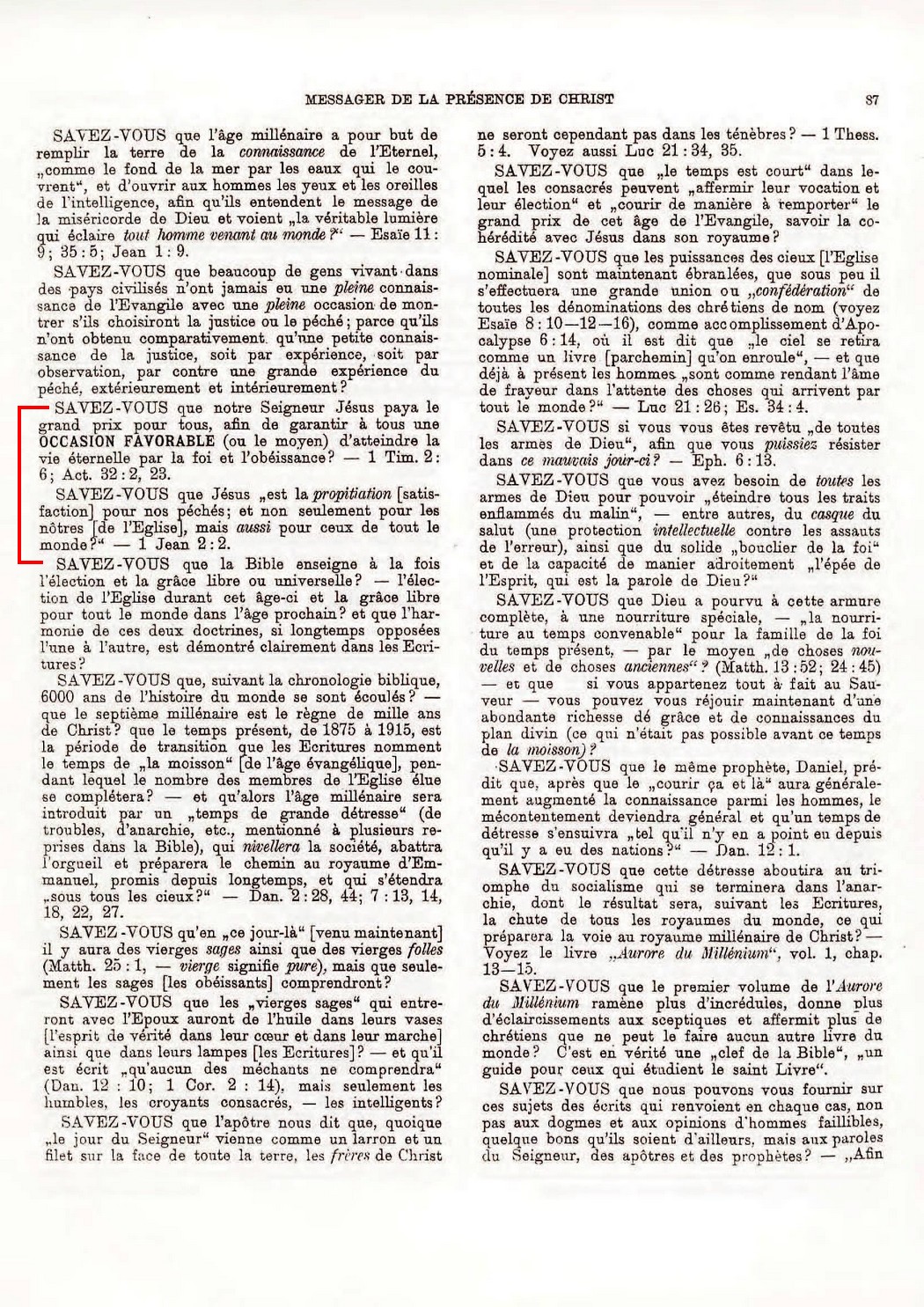 SAVEZ-VOUS que Jésus "est la propitiation [satisfaction] pour nos péchés; et non seulement pour les nôtres [de l'Eglise], mais aussi pour ceux de tout le monde?" - 1 Jean 2:2. Source : 🇫🇷 Le Phare de la Tour de Sion, Novembre 1904, page 87 |