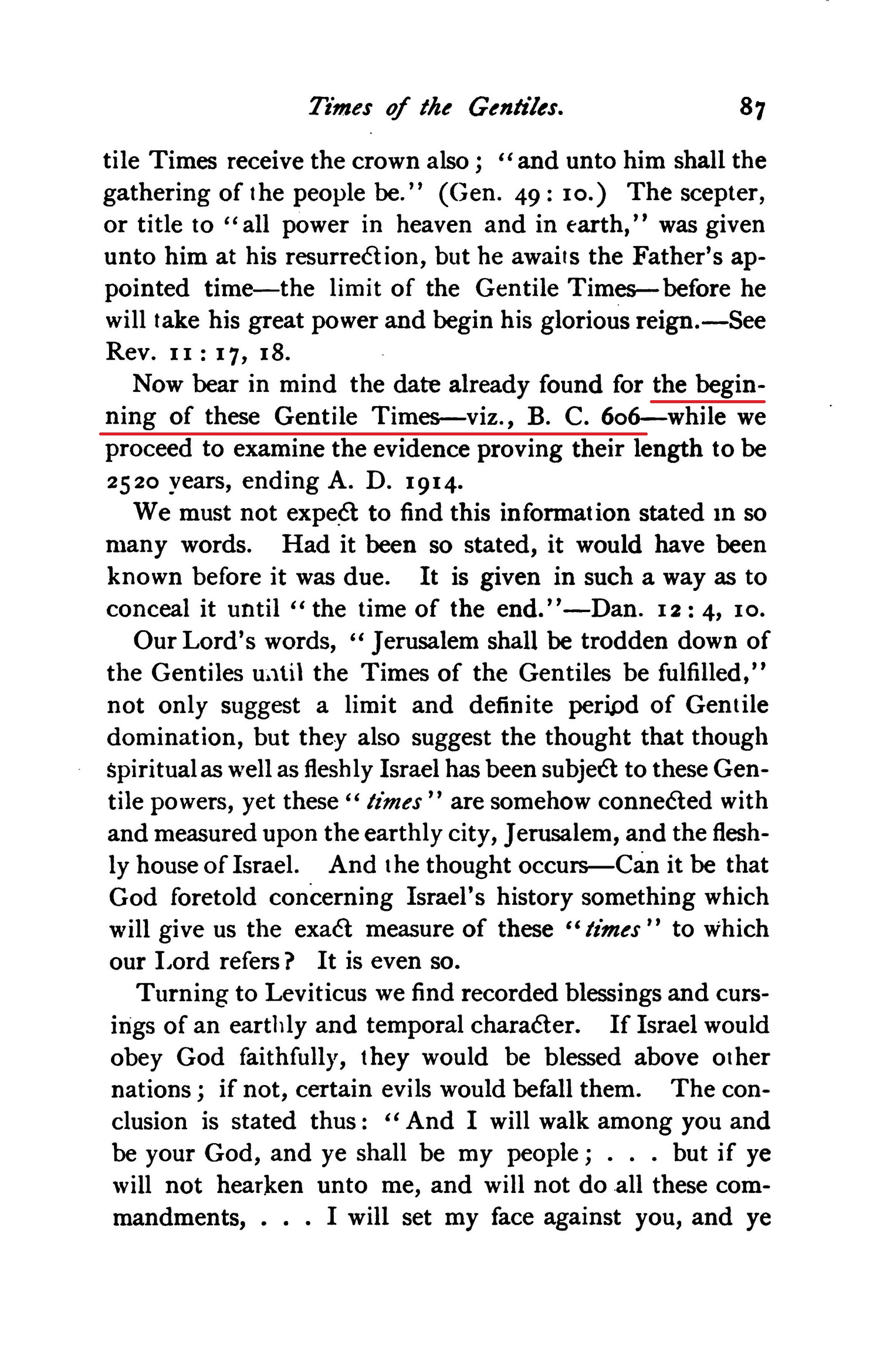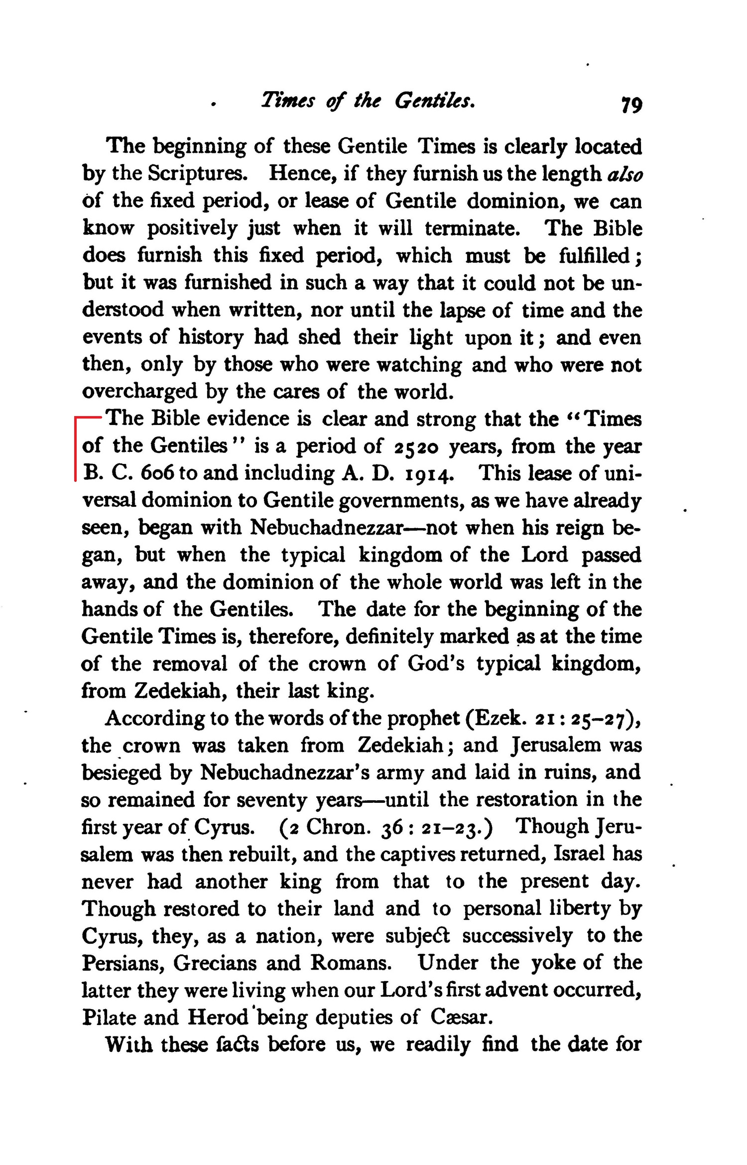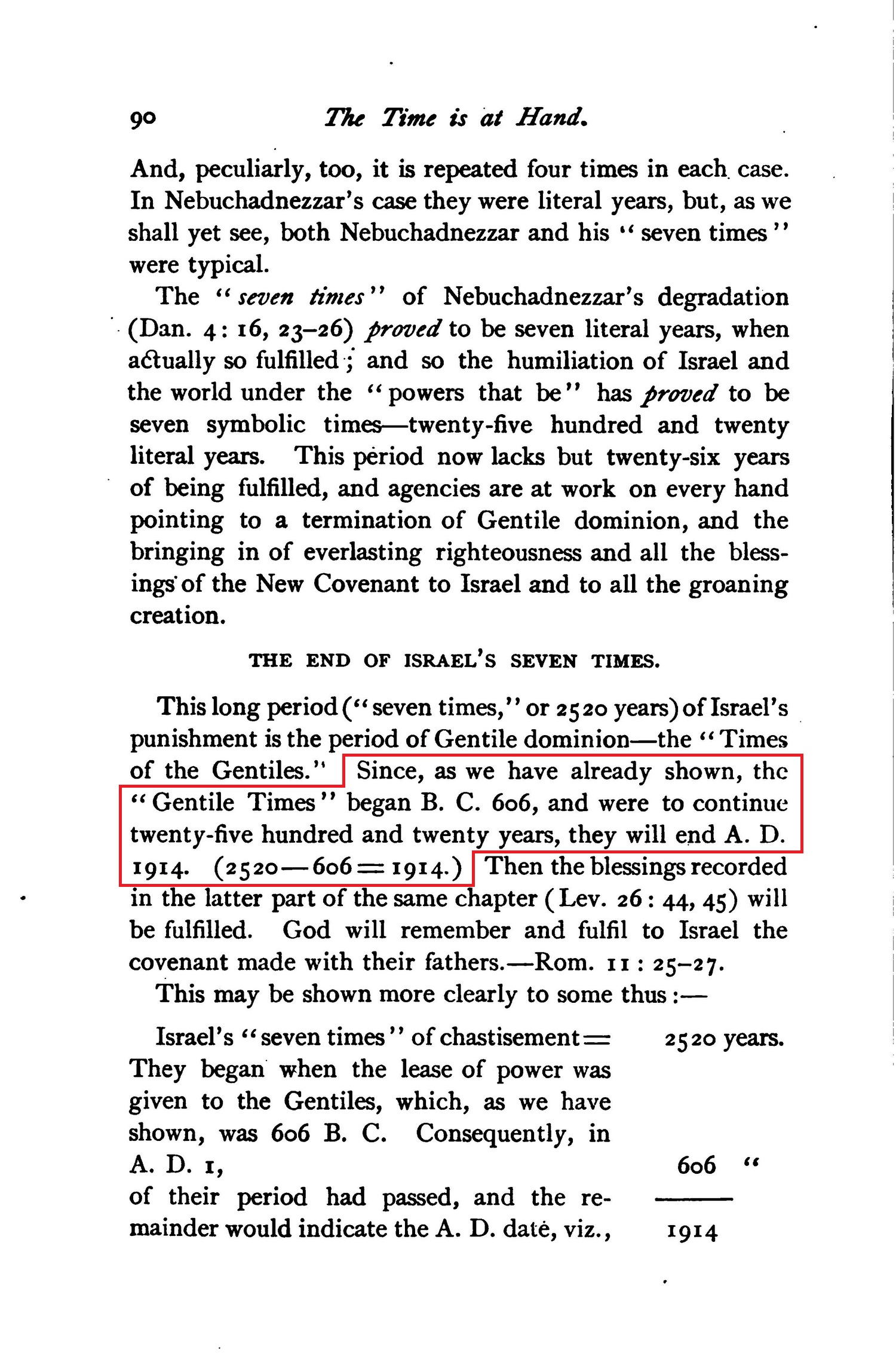 Now bear in mind the date already found for the beginning of these Gentile Times - viz., B.C. 606 - while we proceed to examine the evidence proving their length to be 2520 years, ending A. D. 1914.