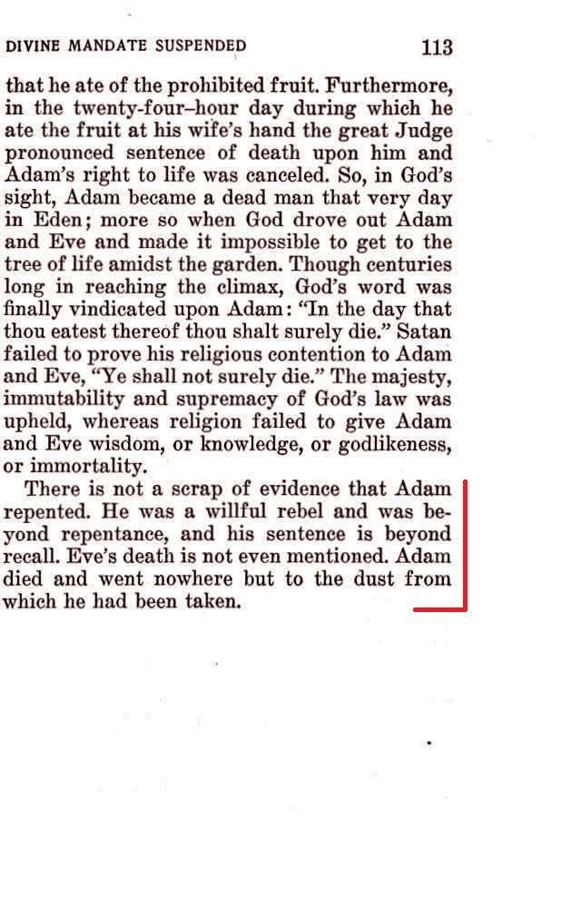 There is not a scrap of evidence that Adam repented. He was a willful rebel and was beyond repentance, and his sentence is beyond recall. [...] Adam died and went nowhere but to the dust from which he had been taken.