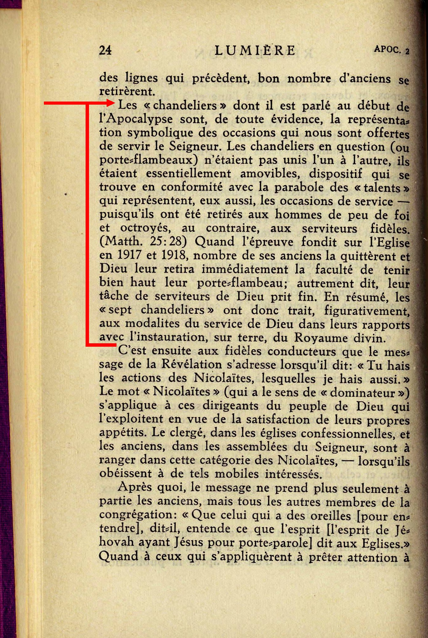Les "chandeliers" dont il est parlé au début de l'Apocalypse sont, de toute évidence, la représentation symbolique des occasions qui nous sont offertes de servir le Seigneur. Le chandeliers en question (ou porte-flambeaux) n'étaient pas unis l'un à l'autre, ils étaient essentiellement amovibles, dispositif qui se trouve en conformité avec la parabole des "talents" qui représentent, eux aussi, les occasions de service - puisqu'ils ont été retirés aux hommes de peu de foi et octroyés, au contraire, aux serviteurs fidèles. (Matth. 25:28) Quand l'épreuve fondit sur l'Eglise en 1917 et 1918, nombre de ses anciens la quittèrent et Dieu leur retira immédiatement la faculté de tenir bien haut leur porte-flambeau; autrement dit, leur tâche de serviteurs de Dieu prit fin. En résumé, les "sept chandeliers" ont donc trait, figurativement, aux modalités du service de Dieu dans leurs rapports avec l'instauration, sur terre, du Royaume divin.