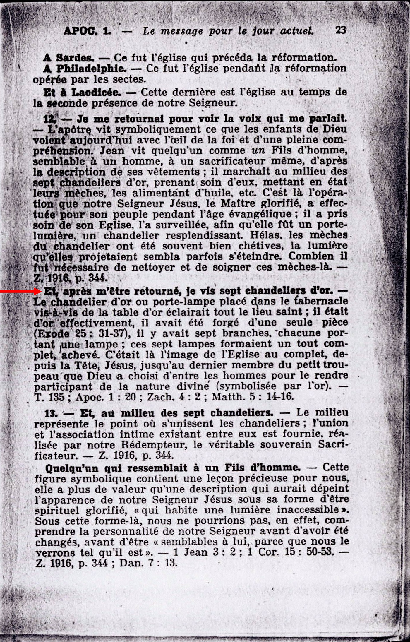 Et, après m'être retourné, je vis sept chandeliers d'or. Le chandelier d'or ou porte-lampe placé dans le tabernacle vis-à-vis de la table d'or éclairait tout le lieu saint; il était d'or effectivement, il avait été forgé d'une seule pièce (Exode 25: 31-37), il y avait sept branches, chacune portant une lampe ; ces sept lampes formaient un tout complet, achevé. C'était là l'image de l'Eglise au complet, depuis la Tête, Jésus, jusqu'au dernier membre du petit troupeau que Dieu a choisi d'entre les hommes pour le rendre participant de la nature divine (symbolisé par l'or). Source : 🇫🇷 1917 - Etudes des écritures, vol 7, le Mystère Accompli, page 23 + Cover |