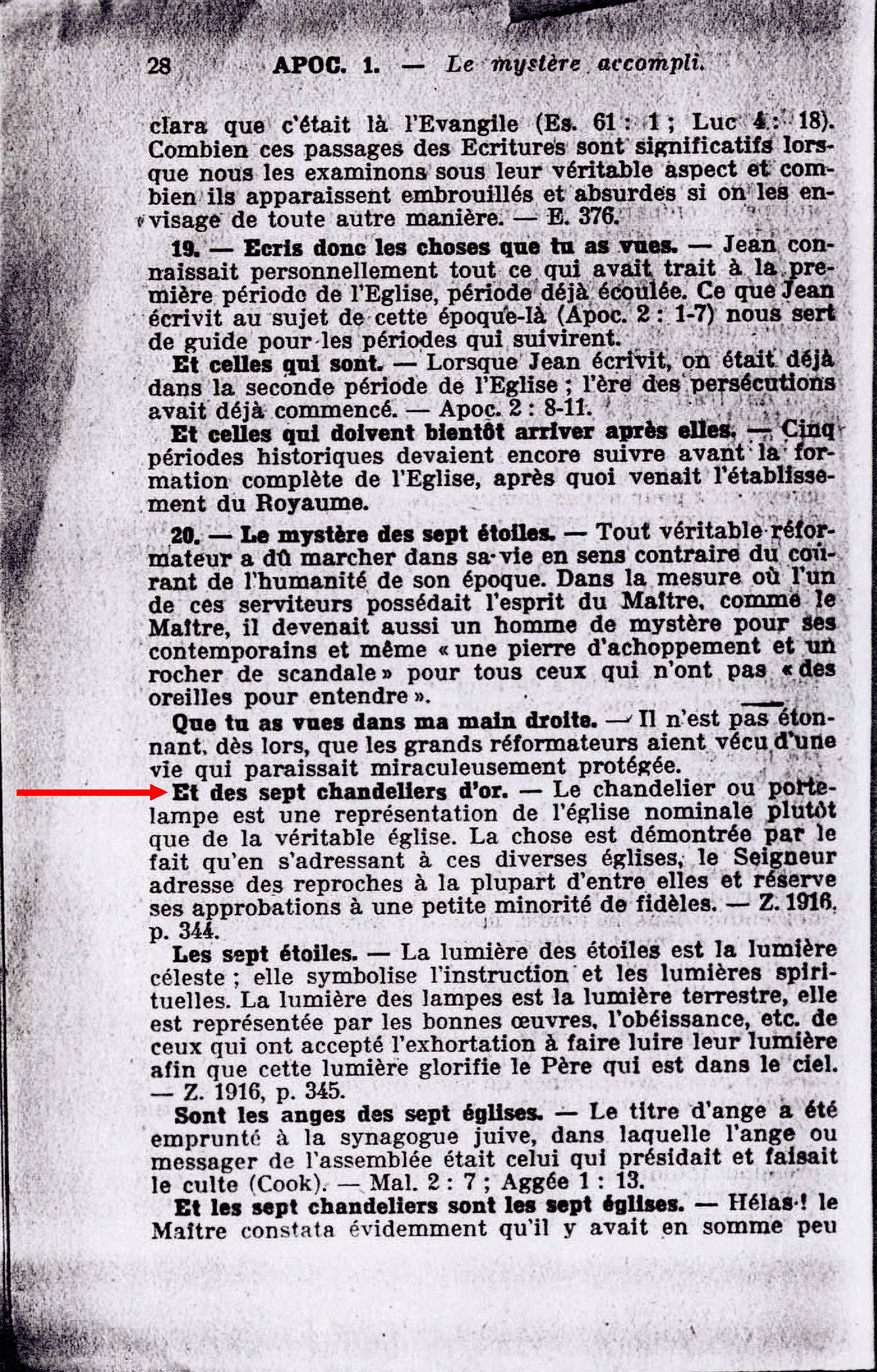 Et des sept chandeliers d'or. - Le chandelier ou porte-lampe est une représentation de l'église nominale plutôt que de la véritable église. La chose est démontrée par le fait qu'en s'adressant à ces diverses églises, le Seigneur adresse des reproches à la plupart d'entre elles et réserve ses approbations à une petite minorité de fidèles. Source : 🇫🇷 1917 - Etudes des écritures, vol 7, le Mystère Accompli, page 28 + Cover |