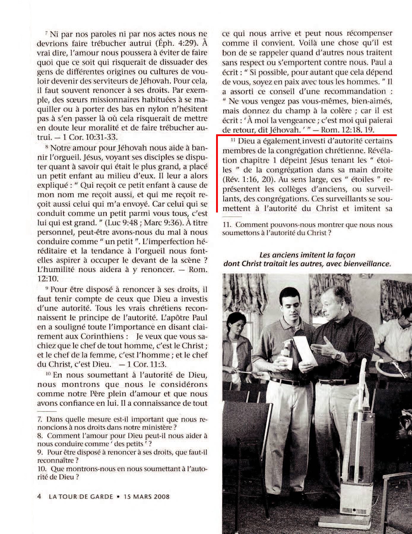 Dieu a également investi d’autorité certains membres de la congrégation chrétienne. Révélation chapitre 1 dépeint Jésus tenant les “étoiles” de la congrégation dans sa main droite (Rév. 1:16, 20). Au sens large, ces “étoiles” représentent les collèges d’anciens, ou surveillants, des congrégations. Ces surveillants se soumettent à l’autorité du Christ et imitent sa bonté dans leurs rapports avec les autres. Tous les membres de la congrégation se soumettent à la disposition prévue par Jésus, selon laquelle “ l’esclave fidèle et avisé ” fournit la nourriture spirituelle en temps voulu (Mat. 24:45-47). Aujourd’hui, en étant disposés à étudier ce qui nous est proposé et à le mettre en pratique, nous montrons que nous nous soumettons personnellement à l’autorité du Christ, ce qui contribue à la paix et à l’unité. — Rom. 14:13, 19.