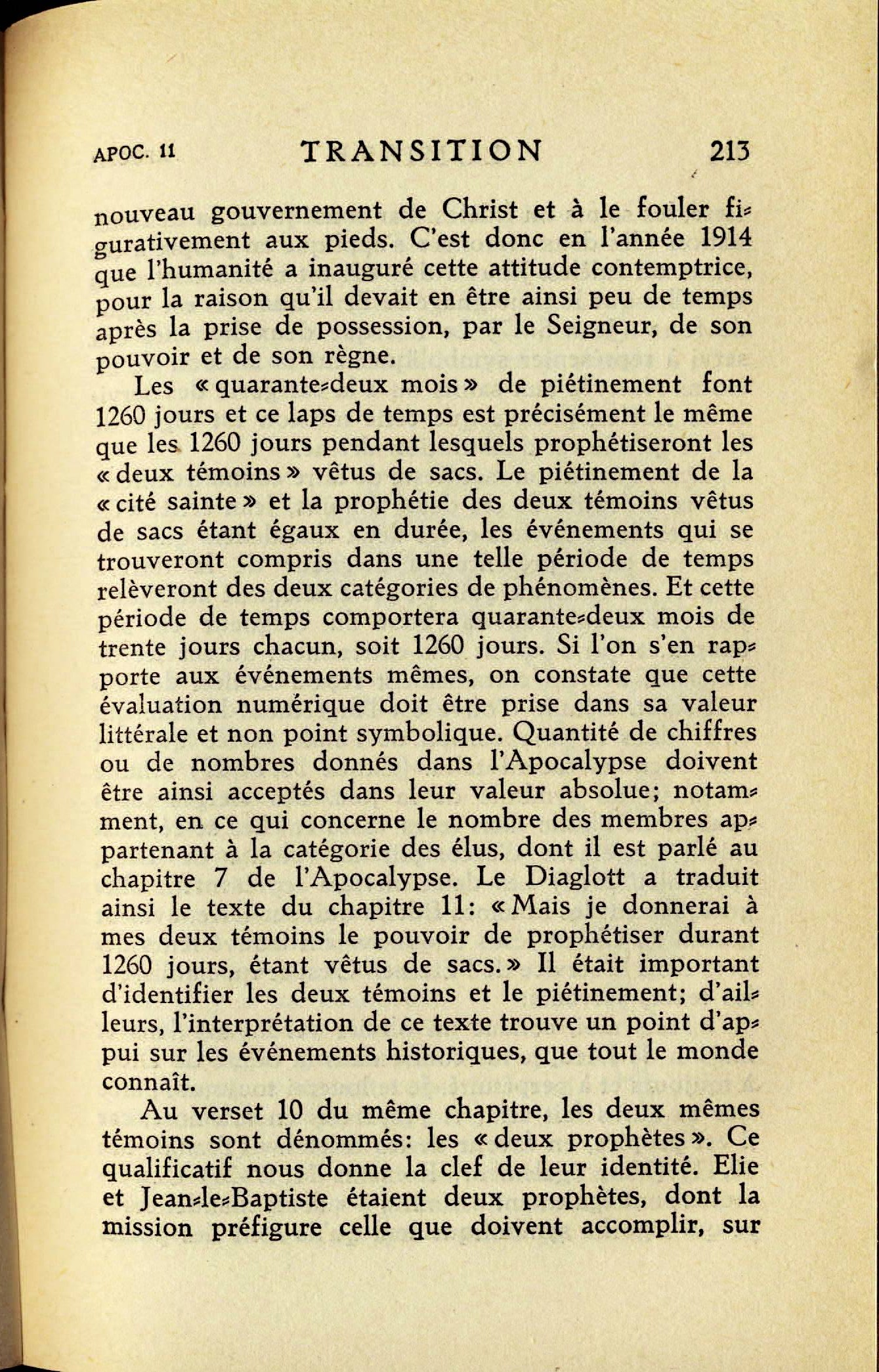 Il est ensuite écrit: "Et ils fouleront aux pieds la sainte cité pendant quarante-deux mois". Le mot "ils" s'applique indubitablement à ceux qui font échec au Royaume de Dieu et qui le traitent, ainsi que ceux qui le représentent, avec mépris. Ce fut en 1914 que Christ Jésus fut placé sur son trône; ce fut également à partir de cette époque que les nations de la terre commencèrent à manifester du mépris à l'égard du nouveau gouvernement de Christ et à le fouler figurativement aux pieds. C'est donc en l'année 1914 que l'humanité a inauguré cette attitude contemptrice, pour la raison qu'il devait en être ainsi peu de temps après la prise de possession, par le Seigneur, de son pouvoir et de son règne. Les "quarante-deux mois" de piétinement font 1260 jours et ce laps de temps est précisément le même que les 1260 jours pendant lesquels prophétiseront les "deux témoins" vétus de sacs. Source : 🇫🇷 1930 - Lumière, vol 1, page 212, page 213 + Cover |