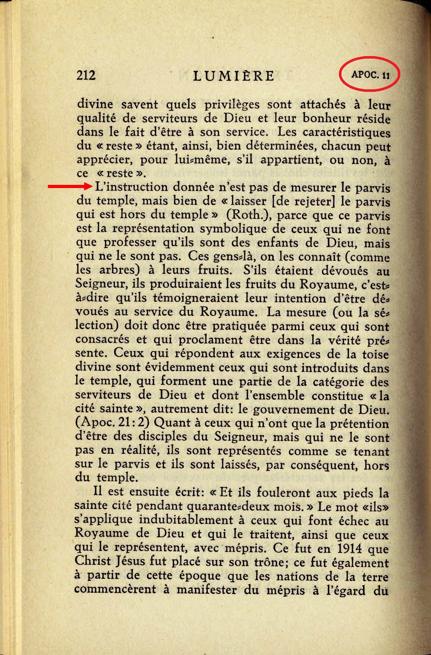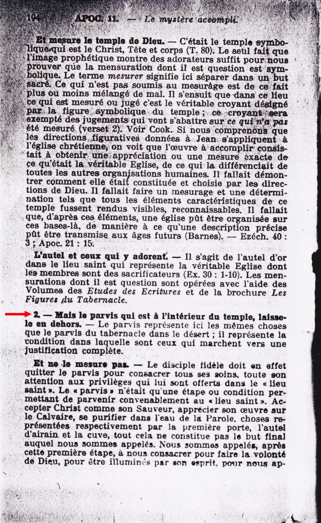 L'instruction donnée n'est pas de mesurer le parvis du temple, mais bien de "laisser [de rejeter] le parvis qui est hors du temple" (Roth.), parce que ce parvis est la représentation symbolique de ceux qui ne font que professer qu'ils sont des enfants de Dieu, mais qui ne le sont pas. Source : 🇫🇷 1930 - Lumière, vol 1, page 212 + Cover |